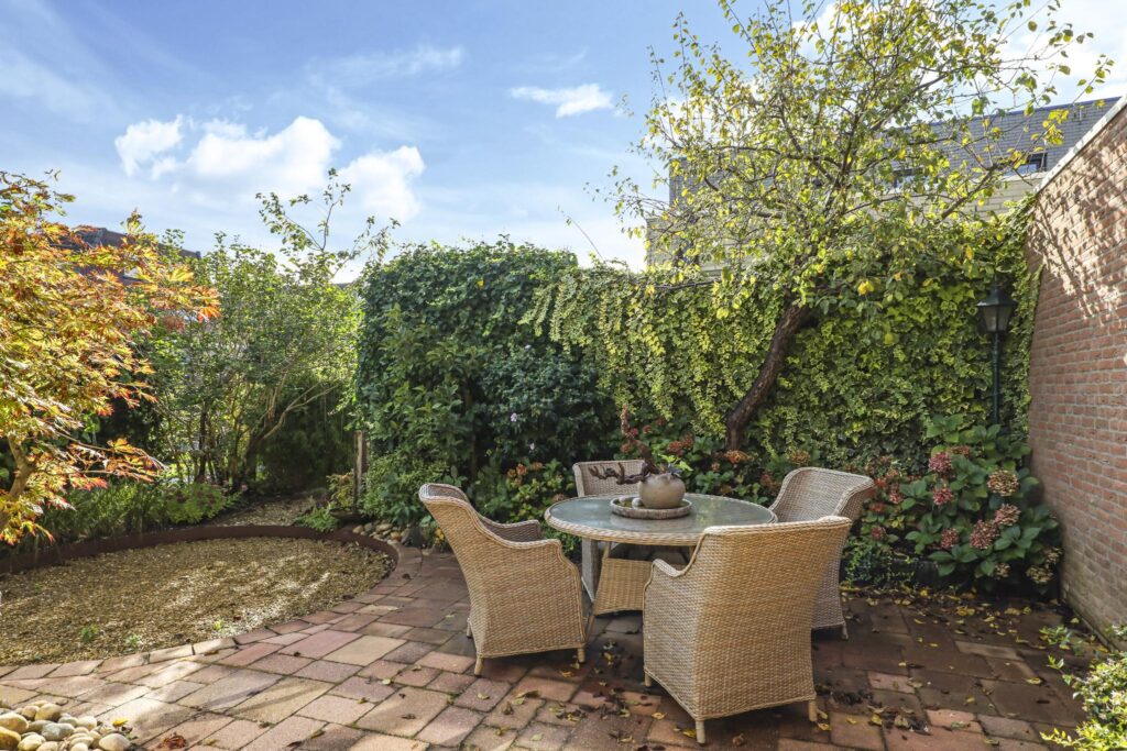 De achtertuin van deze woning is zeker niet standaard te noemen. De vormgeving is anders waardoor je meerdere zithoeken kunt creëren zoals het terras helemaal achterin de tuin. En hou je van de zon, dan geniet je hier veel zonuren aangezien de tuin op het zuid/oosten is gelegen. Zit je liever wat beschut, dan zoek je de aangebouwde veranda op. Deze stijlvol in douglashout opgebouwde veranda is ca. 10m2 groot en biedt ruimte aan een lekkere loungeset. Wat opvalt is de relatief vrije ligging aan de achterzijde. Je hebt geen directe achterburen waardoor er ook minder inkijk is. Groene hagen en enkele boompjes zorgen voor een groen karakter.