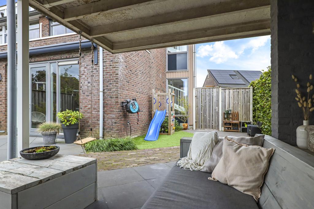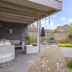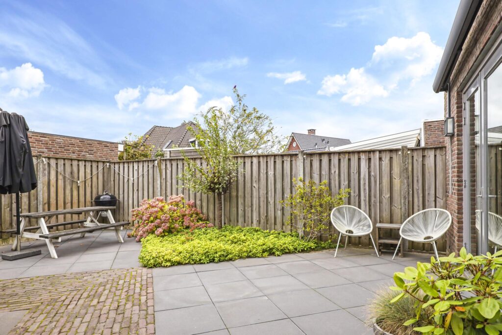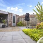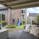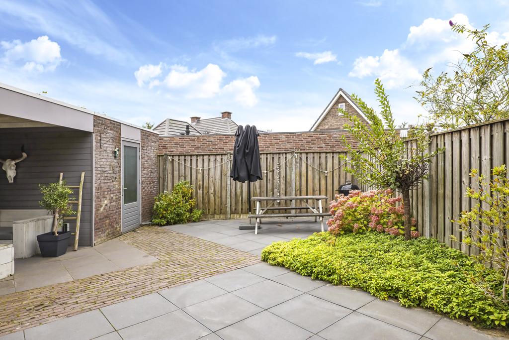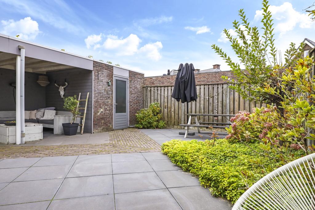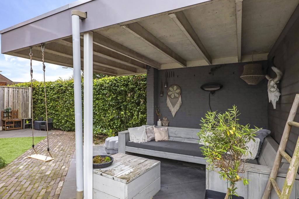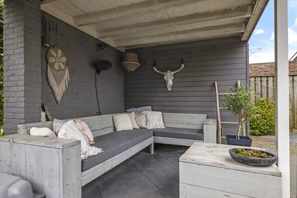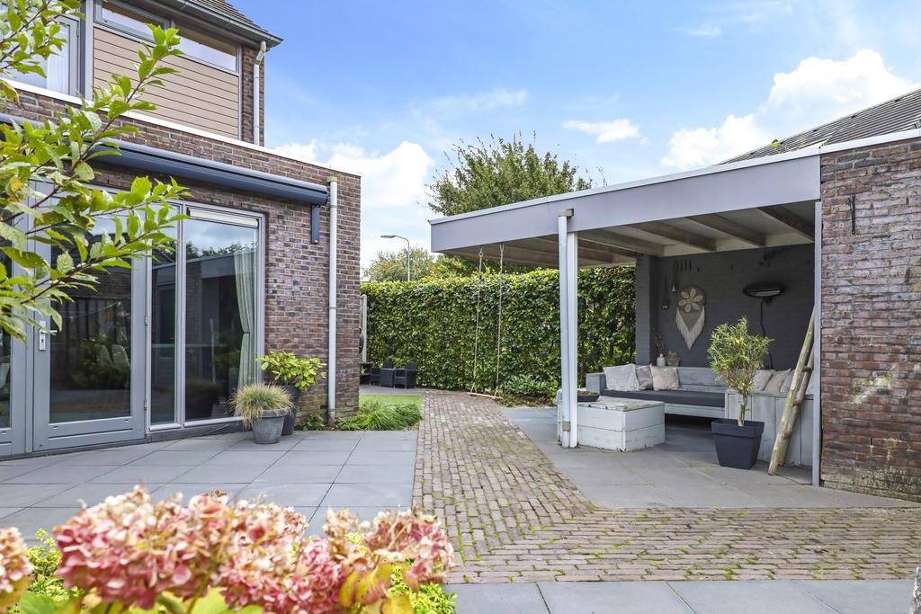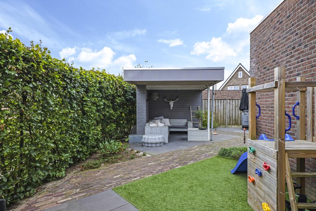 Van oorsprong had deze woning een vrijstaande, stenen garage echter deze is opgedeeld in een schuur en een terrasoverkapping (veranda). Vaak zien we bij nieuwbouwwoningen een houten schuur, maar deze is van dus van steen (9m2). Hier kun je met gemak meerdere (elektrische) fietsen en/of een motor stallen. Het voorste gedeelte biedt een heerlijk, overdekt buitenterras (13m2). Het platte dak is zelfs verlengd waardoor je er met gemak een grote loungeset kwijt kunt. Groot formaat tegels (60×60) en een gebakken klinkerpad maken het totaalplaatje compleet.