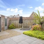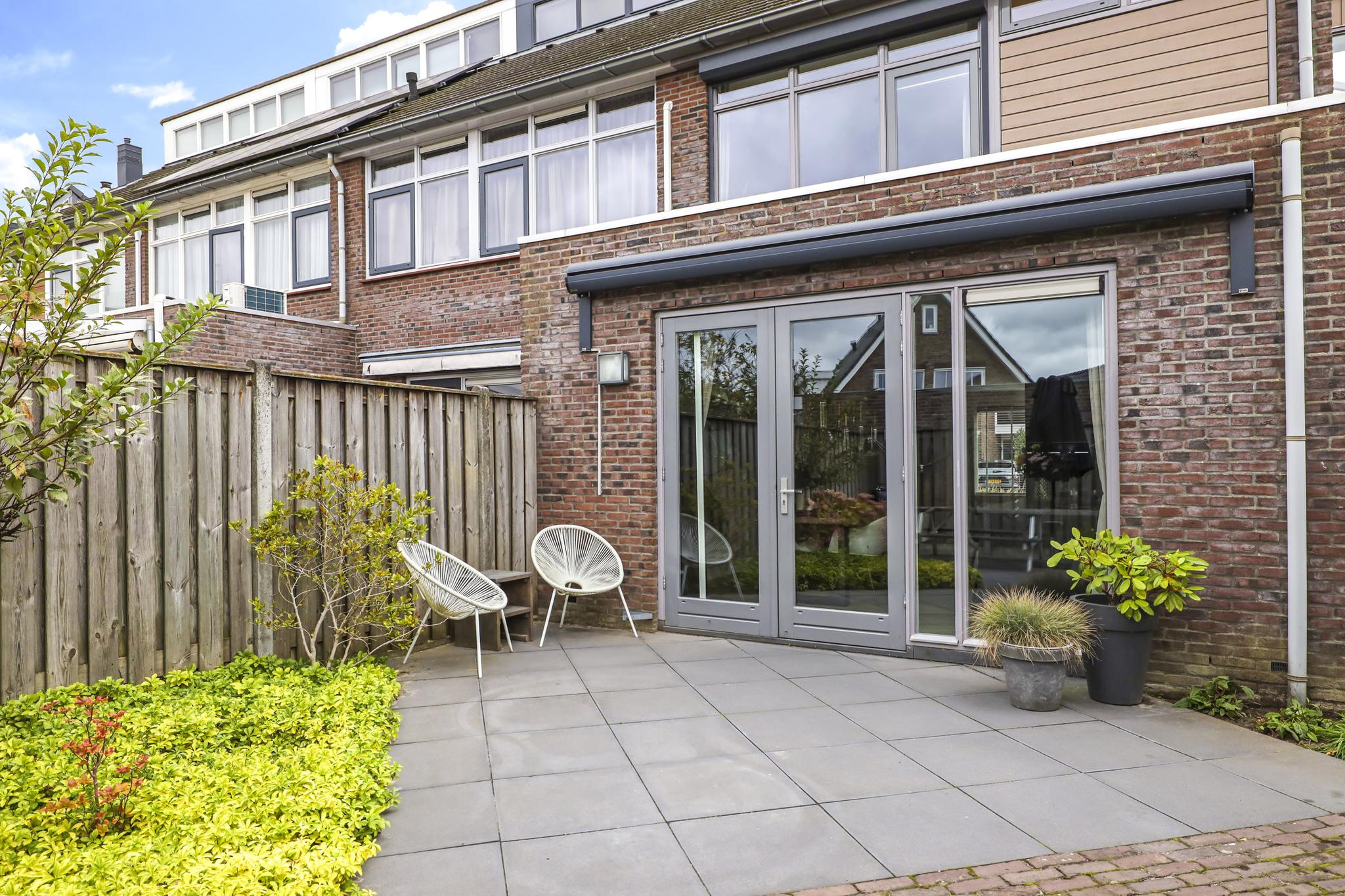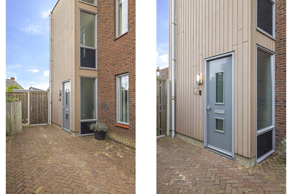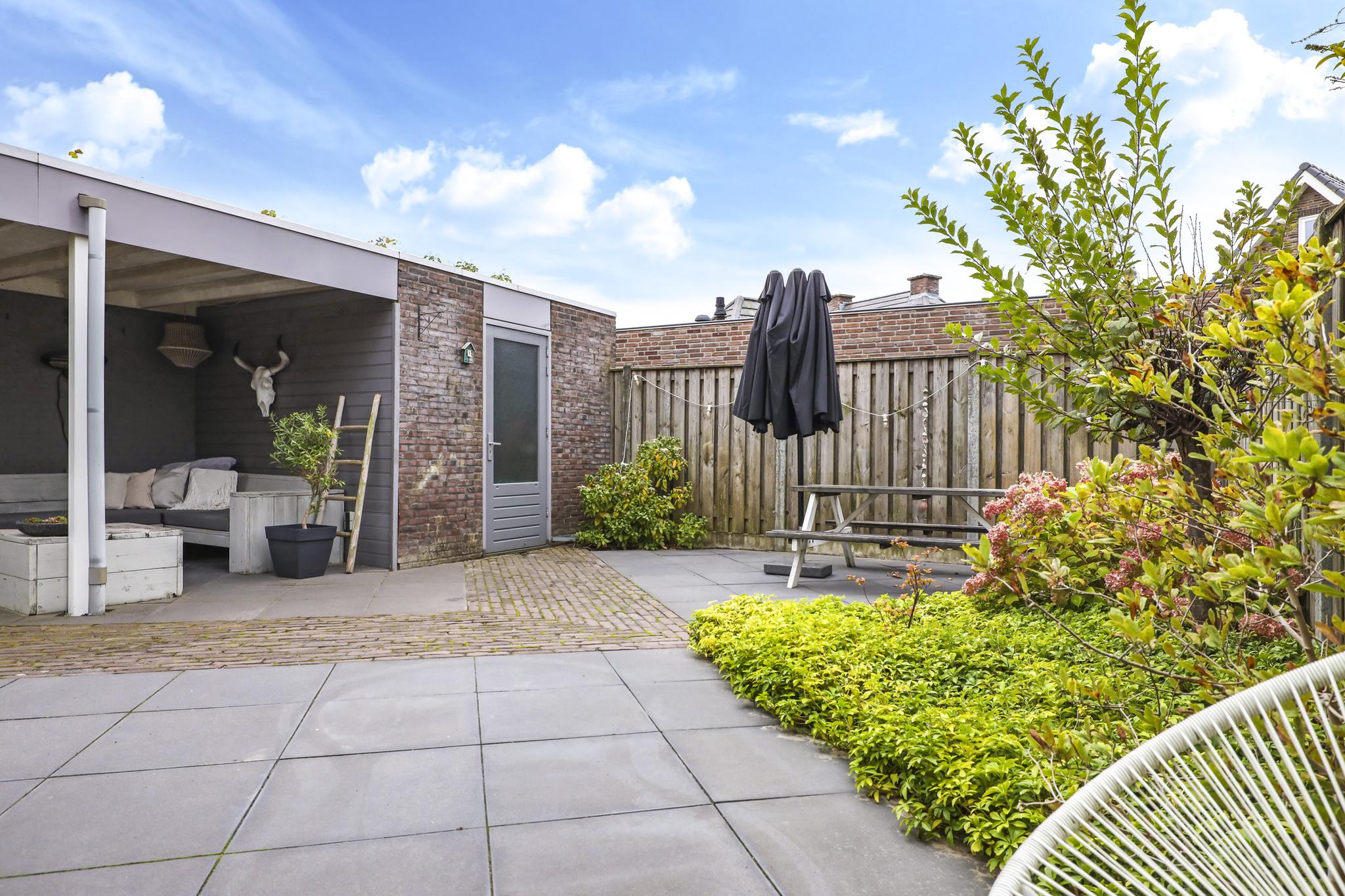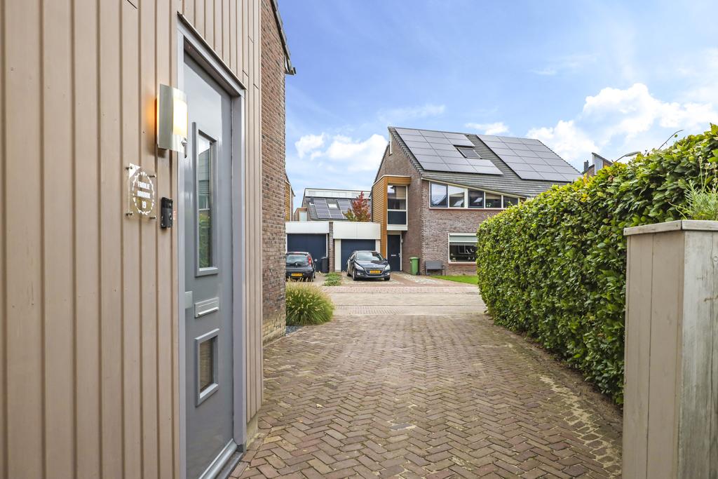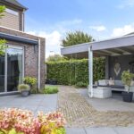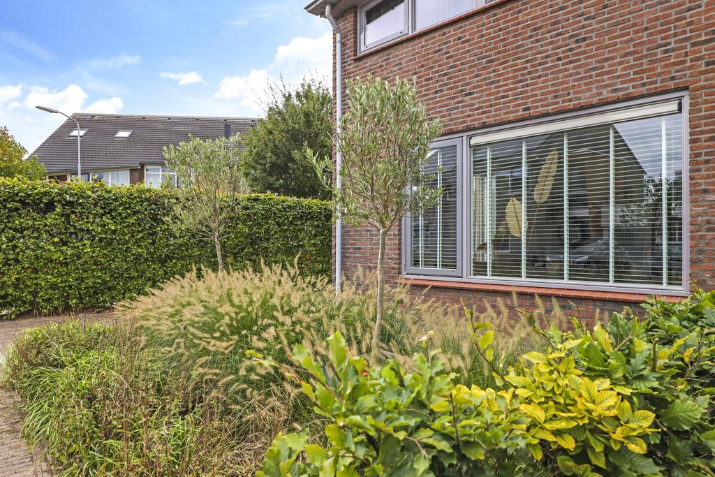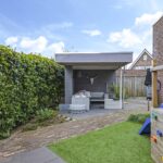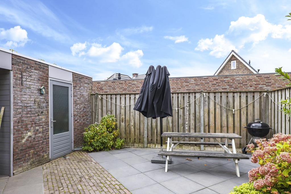 Van oorsprong had deze woning een vrijstaande, stenen garage echter deze is opgedeeld in een schuur en een terrasoverkapping (veranda). Vaak zien we bij nieuwbouwwoningen een houten schuur, maar deze is van dus van steen (9m2). Hier kun je met gemak meerdere (elektrische) fietsen en/of een motor stallen. Het voorste gedeelte biedt een heerlijk, overdekt buitenterras (13m2). Het platte dak is zelfs verlengd waardoor je er met gemak een grote loungeset kwijt kunt. Groot formaat tegels (60×60) en een gebakken klinkerpad maken het totaalplaatje compleet.