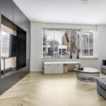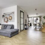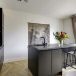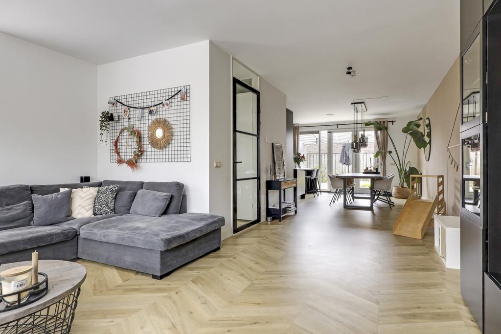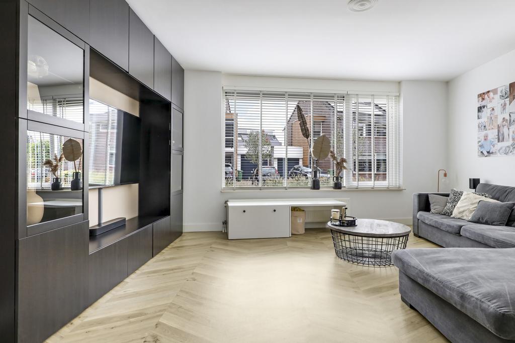 De woonkamer heeft iets gezelligs in zich. Wellicht komt dit door het speelse karakter van de voorgevel en de prettige lichtinval van onder meer het zijgevelraam. Maar ook de vinylvloer met ‘Hongaarse punt-motief’ draagt bij aan een warme woonsfeer. De zithoek is 4,2 meter diep en 5,1 meter breed waardoor je er prima een grote hoekbank kwijt kunt. Een lange muur nodigt je uit om een TV aan de wand te hangen.