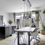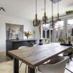 Uitgebouwde leefkeuken met eethoek, eilandopstelling en dubbele terrasdeuren.