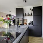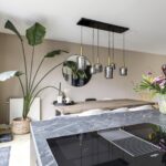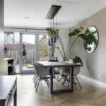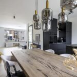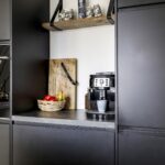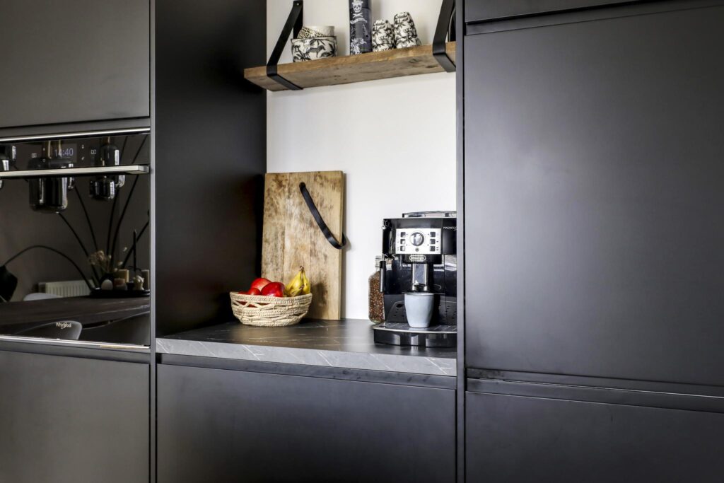 In de hoge kastenwand vindt je de overige inbouwapparatuur zoals een koelkast en een oven. Leuk detail is het werkblad tussen de 2 hoge kasten waardoor er een soort van ‘koffiecorner’ is gecreëerd. Dubbele tuindeuren geven direct toegang tot het buitenterras.