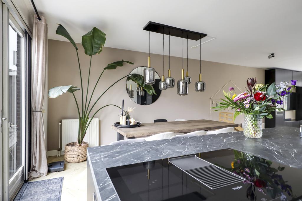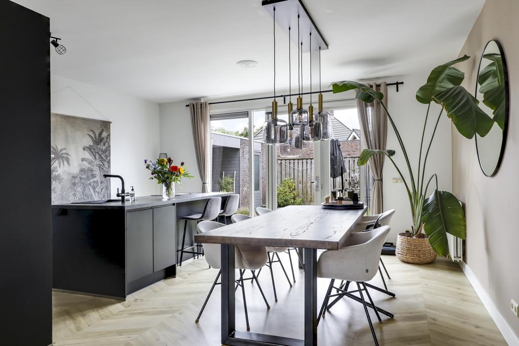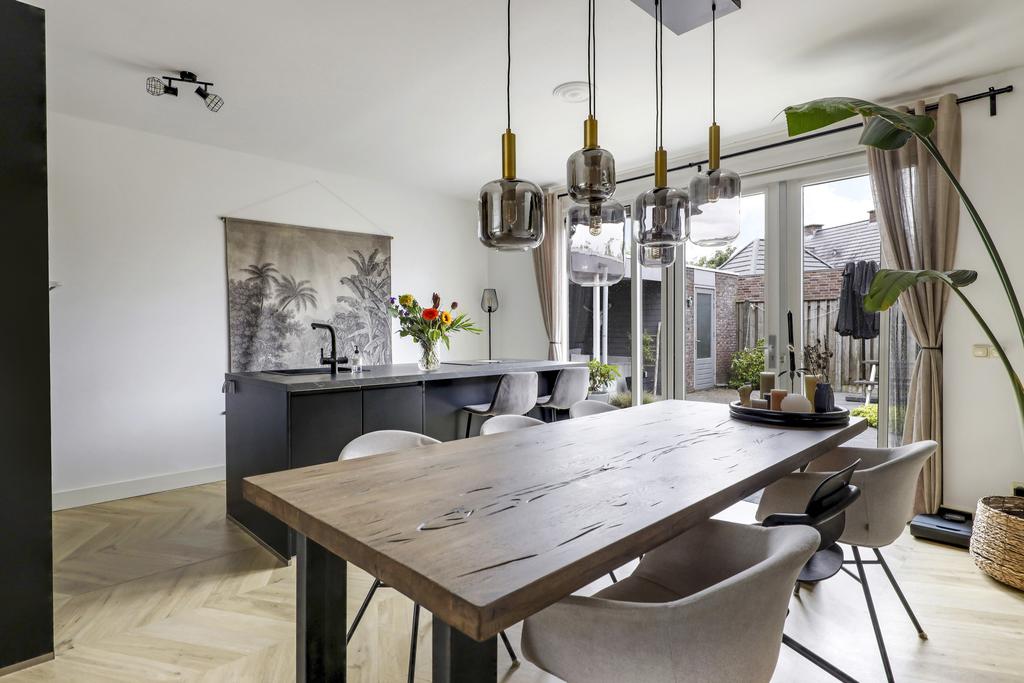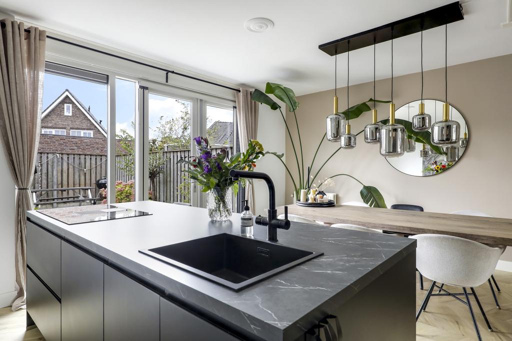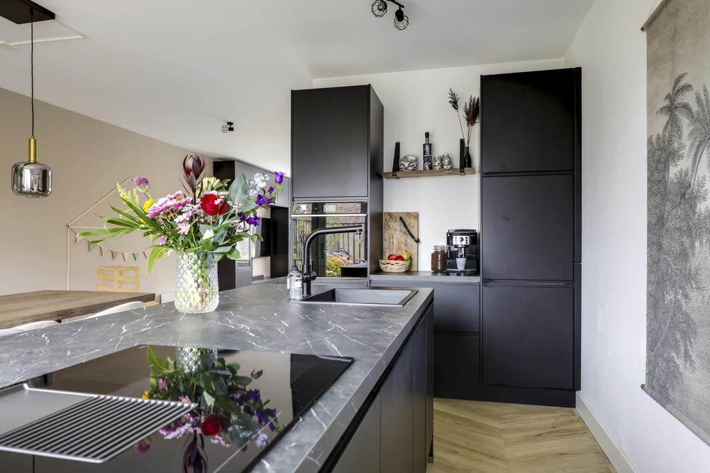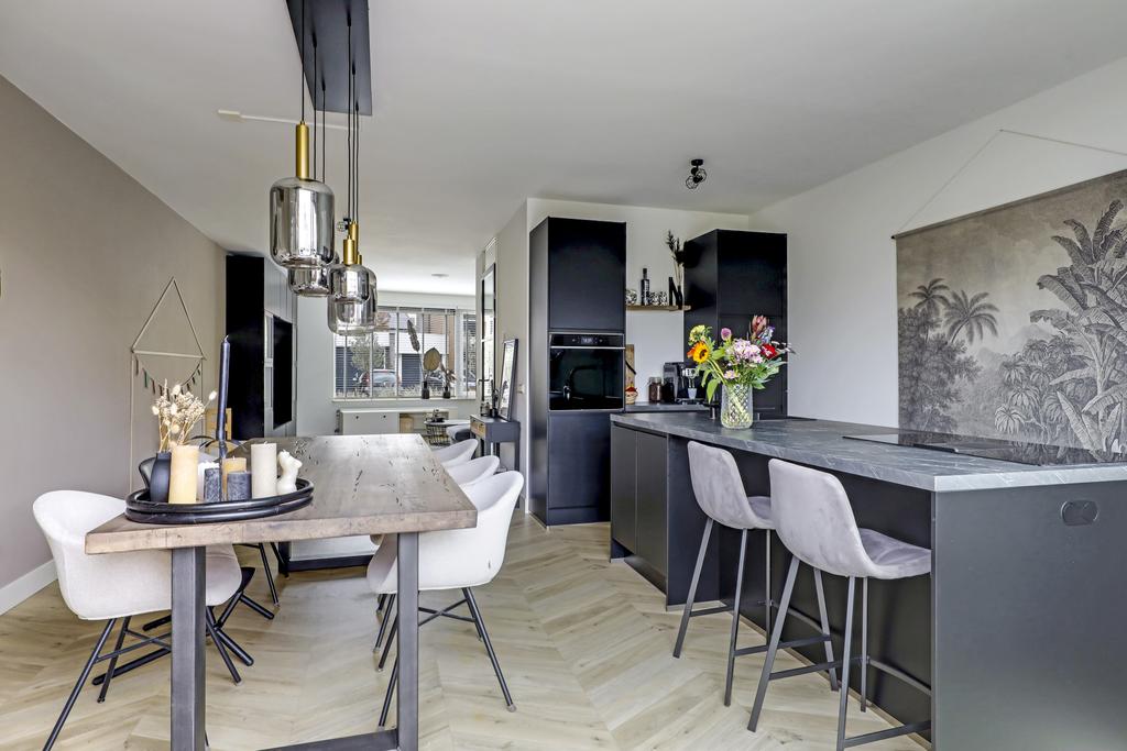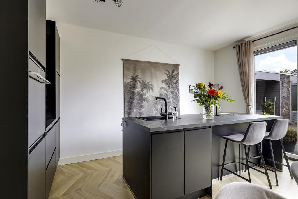 De keuken is dé eye-catcher van deze woning. Door de aanbouw is de keuken aanzienlijk vergroot waardoor er ruimte ontstond voor een echte eilandkeuken. Het eiland is voorzien van zowel een gootsteen met kokend waterkraan en een inductie kookplaat met geïntegreerde afzuiger. Er tussenin is een vaatwasser ingebouwd. Aan de andere kant van het eiland kun je 2 barkrukken aanschuiven. Naast het eiland kun je met gemak een lange eettafel kwijt.