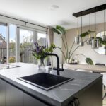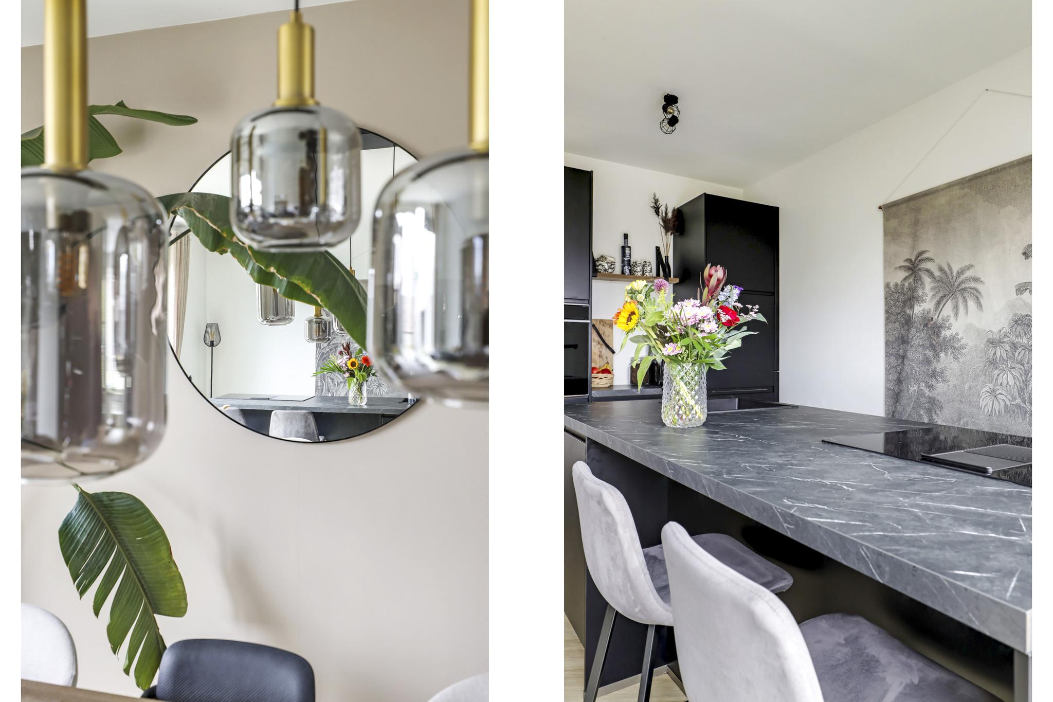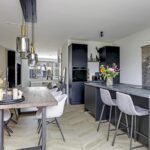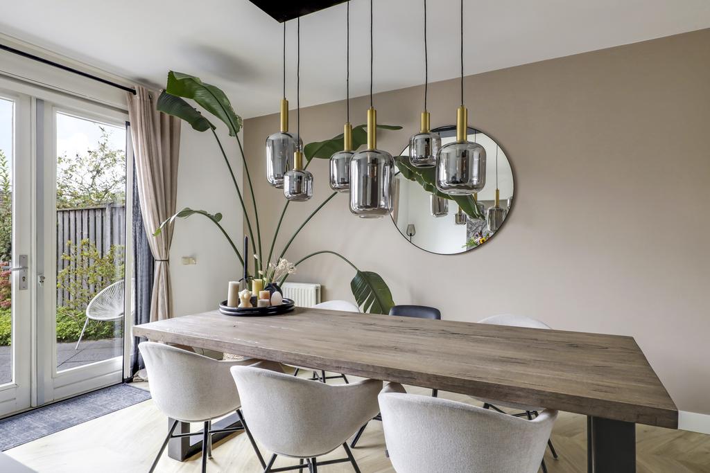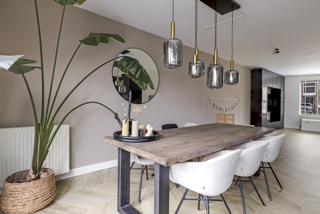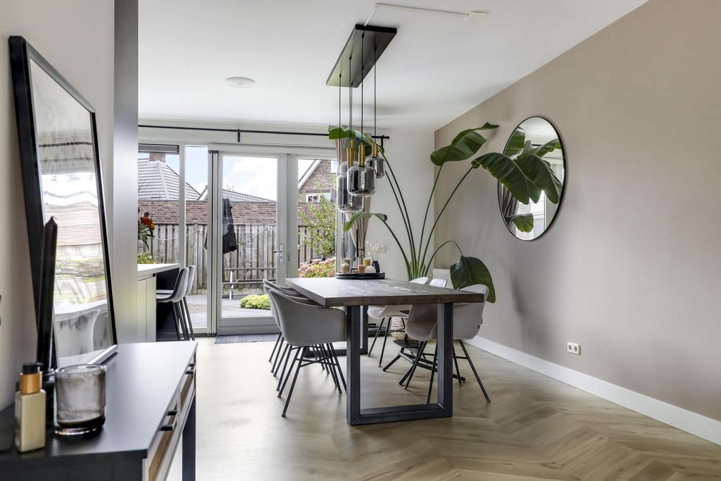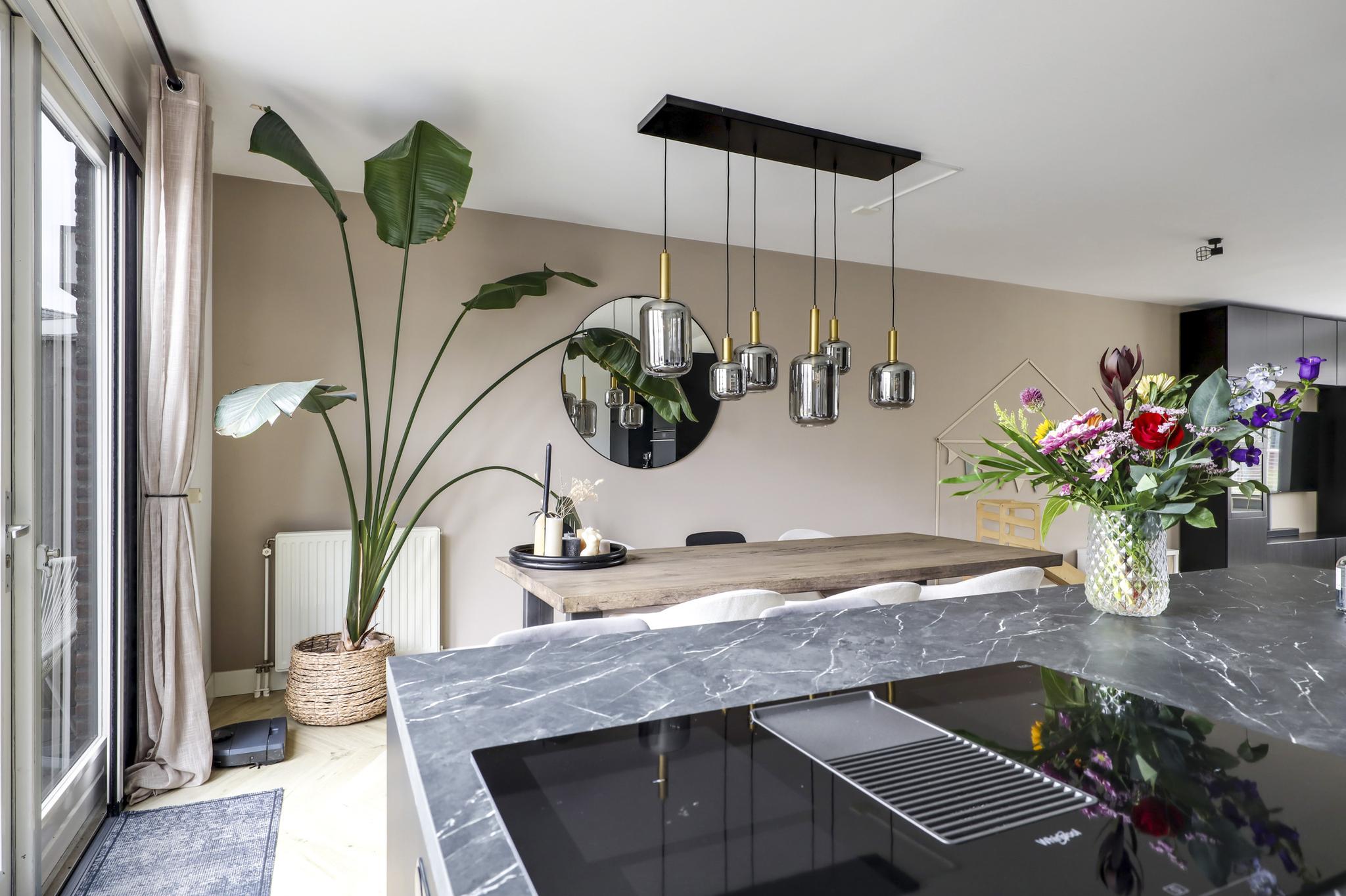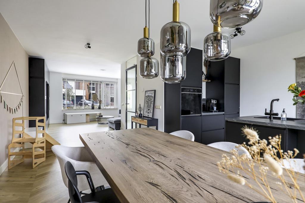 De keuken is dé eye-catcher van deze woning. Door de aanbouw is de keuken aanzienlijk vergroot waardoor er ruimte ontstond voor een echte eilandkeuken. Het eiland is voorzien van zowel een gootsteen met kokend waterkraan en een inductie kookplaat met geïntegreerde afzuiger. Er tussenin is een vaatwasser ingebouwd. Aan de andere kant van het eiland kun je 2 barkrukken aanschuiven. Naast het eiland kun je met gemak een lange eettafel kwijt.