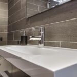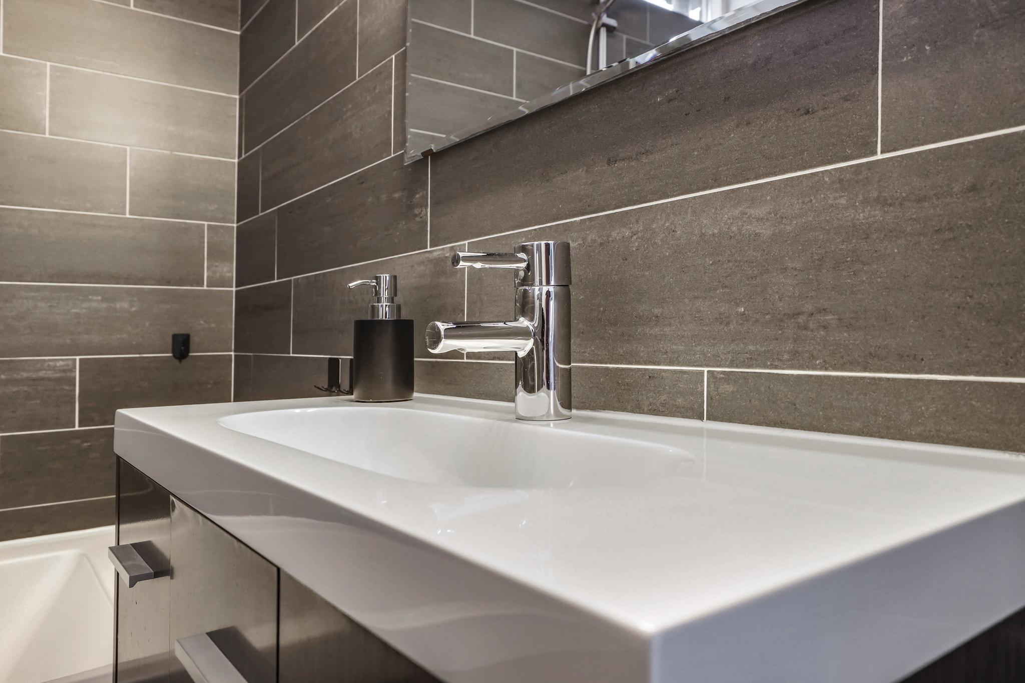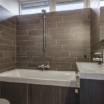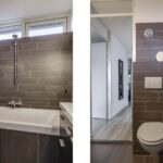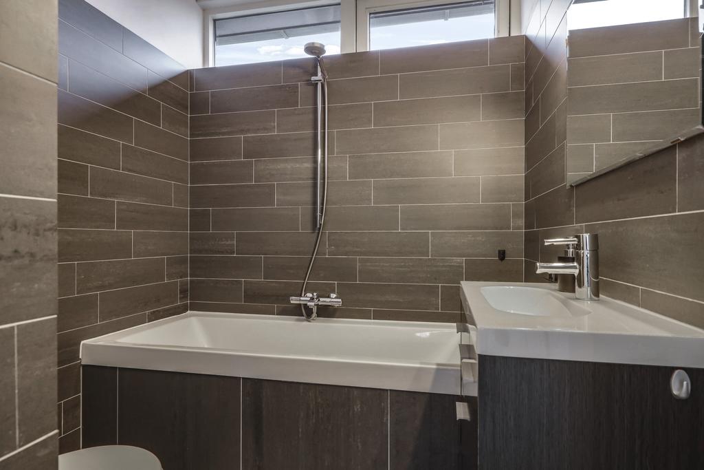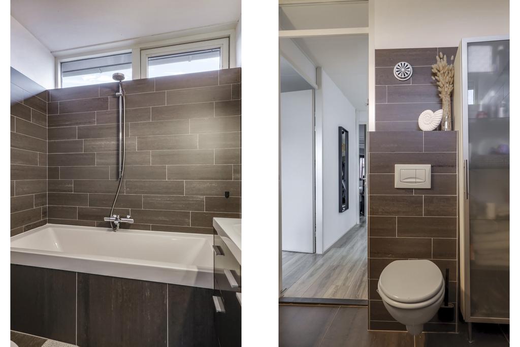De badkamer is strak betegeld hetgeen de badkamer een moderne en frisse uitstraling geeft. De ruimte is ingedeeld met een ligbad/douche, een wastafelmeubel en een 2e (zwevend) toilet. Twee ladekorven in het wastafelmeubel en een kolomkast bieden bovengemiddelde opbergruimte voor toiletspullen. Boven het wasmeubel is een spiegel met spotverlichting geplaatst. Koude voeten hoef je hier niet te krijgen aangezien de vloer is voorzien van vloerverwarming. De ramen zijn hoog geplaatst waardoor je privacy hebt, maar toch ook een prettige lichtinval. Bovendien kun je eenvoudig ventileren door een raam open te zetten. Uiteraard is de badkamer ook v.v. mechanische ventilatie.