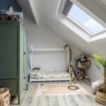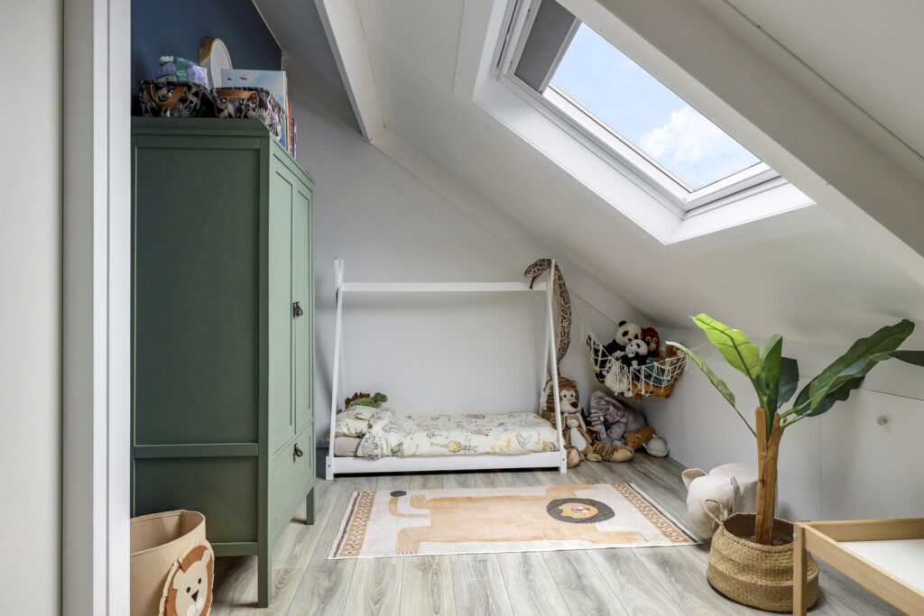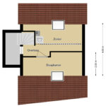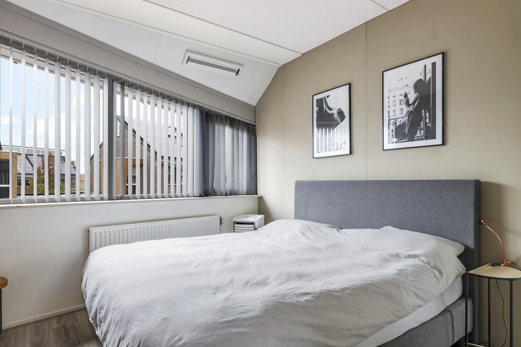 De bovenste woonlaag mag met recht verrassend genoemd worden. Niet alleen vanwege de lessenaarskap met hoge ramen in de (3,4 meter hoge) nok, maar ook omdat er nog een extra slaapkamer is gemaakt. Dit betreft een volwaardige slaapkamer van ca. 10m2 meter. Dat is gemeten vanaf 1,5 meter hoogte waardoor deze kamer eigenlijk nog groter is. Een groot dakvenster zorgt voor de nodige lichtinval.