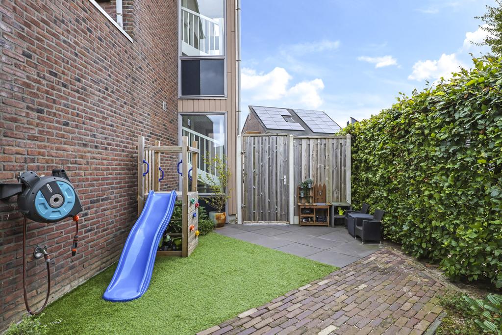Ben je een tuin- en zonliefhebber, dan zal je deze achtertuin zeker aanspreken. Ten eerste omdat deze tuin een gunstige oriëntatie op de zon heeft, namelijk het zuid/westen. Hierdoor vangt de tuin bijna de gehele dag zon. Ten tweede omdat je relatief veel vrijheid en privacy geniet. De achtergelegen woning is relatief ‘laag’ waardoor deze nauwelijks opvalt. Nog een pluspunt is de opvallende breedtemaat. De tuin is maar liefst 10 meter breed hetgeen je ook naast de woning zult merken. De zijtuin is immers meer dan 4 meter breed waardoor je hier een leuke speelhoek voor kleine kinderen kunt maken.