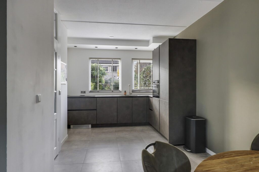 De keuken is een echte eye-catcher aangezien deze een moderne en trendy look en uitstraling heeft. De oorspronkelijke opstelling is compleet gewijzigd waarbij er in 2023 is gekozen voor een uitgebreide hoekopstelling. De inbouwapparatuur bestaat uit een luxe 4-pits inductie kookplaat met geïntegreerde afzuiger, een vaatwasser, een koel/vriescombi en een combi-oven/magnetron. Fraai detail is het aanrechtblad dat als het ware ‘zwevend’ is geplaatst. Verder heeft de keuken praktische kastruimte waaronder brede ladekorven. In een koof langs het plafond zijn inbouwspots geplaatst hetgeen in de donkere avonduren voor sfeerverlichting zorgt.