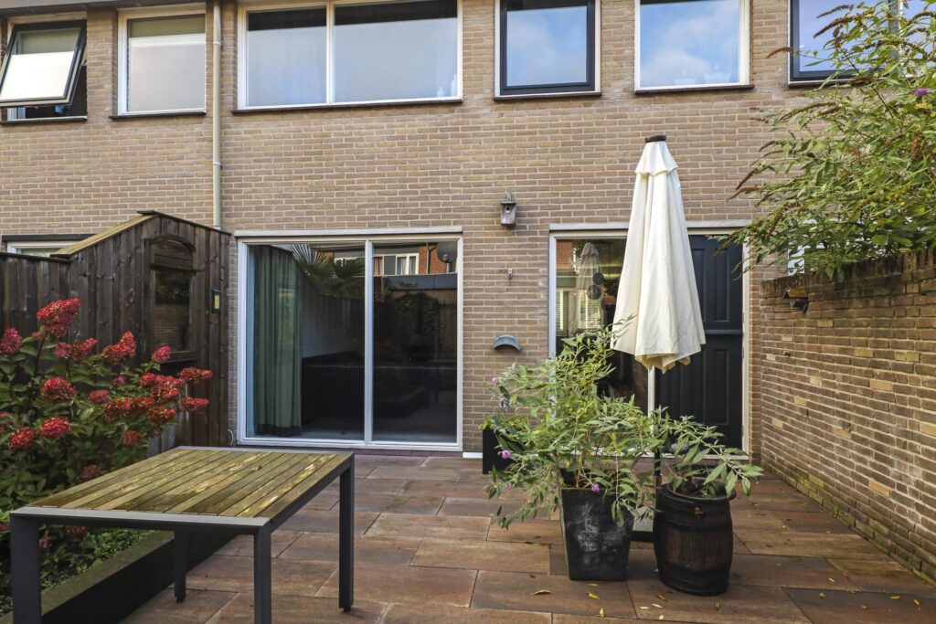 De achtertuin van deze woning heeft een onderhoudsvriendelijk karakter. Het grootste gedeelte is bestraat met groot formaat tegels (80×40). Enkele bloemborders geven de tuin een groene uitstraling. Door het onderhoudsvriendelijke karakter houd je meer tijd over om lekker in de tuin te zitten. Achterin de tuin staat een stenen schuur. Deze heeft op de hoek een glazen pui waardoor de berging een fijne lichtinval geniet. Uiteraard is de berging ook voorzien van elektra-aansluiting. Zowel de voor- als de achtertuin heeft een waterkraantje.