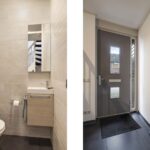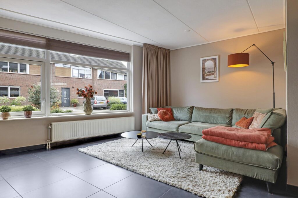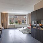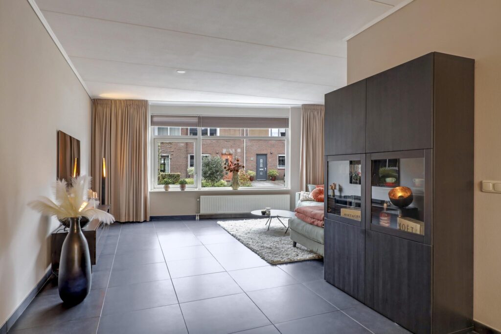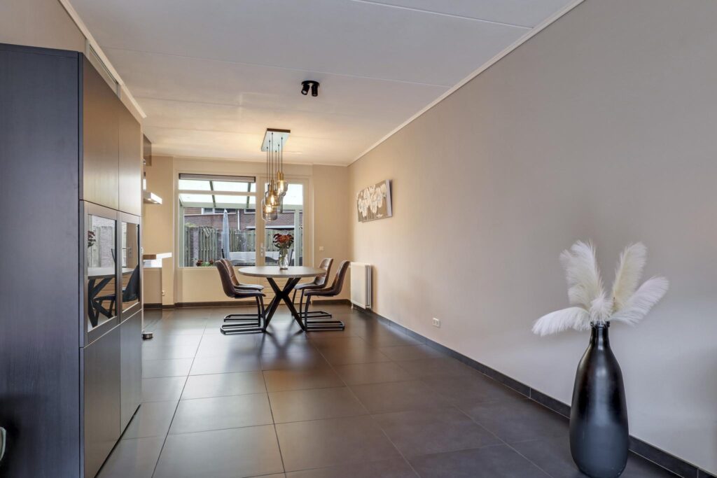 Via een royale hal komen we in de L-vormige woonkamer terecht. Daarbij valt meteen de schuin weglopende voorgevel met grote raampartij op. Hier kun je met gemak een lekkere hoekbank plaatsen. Een lange wand biedt de mogelijkheid tot het ophangen van een groot TV-scherm. De overgang naar de keuken is meer dan 3 meter breed waardoor je er prima een lange eettafel kwijt kunt. Noemenswaardig is de strakke tegelvloer (60×60) die is voorzien van vloerverwarming. Dit zorgt voor een aangename warmte waarbij de vloer altijd comfortabel zal aanvoelen. Een tuindeur in de achtergevel geeft direct toegang tot het overdekte buitenterras.