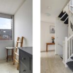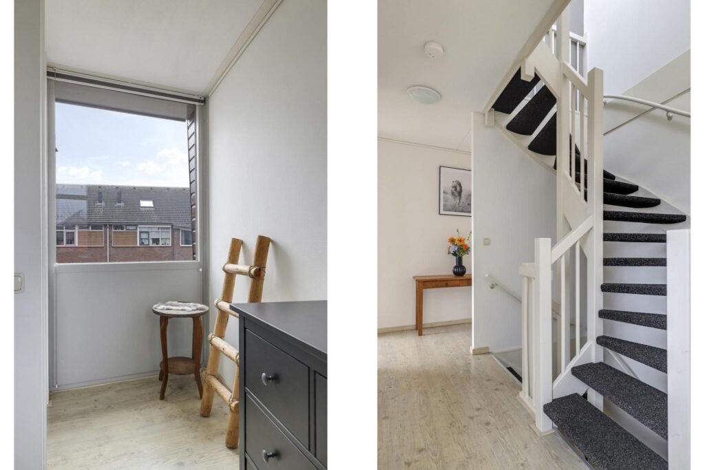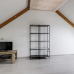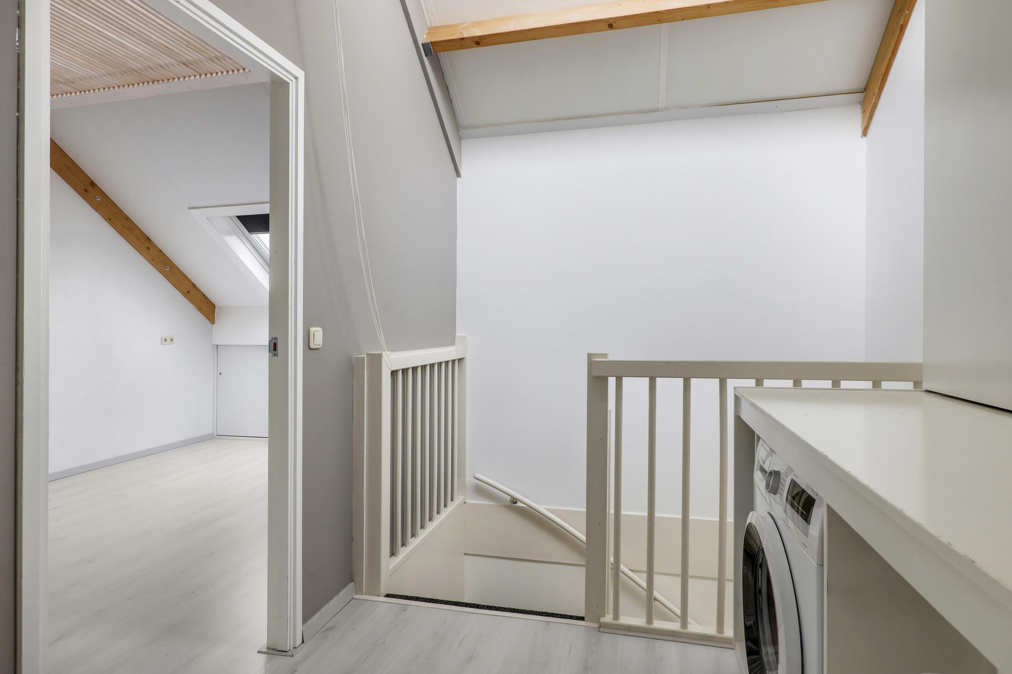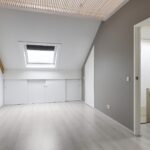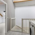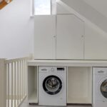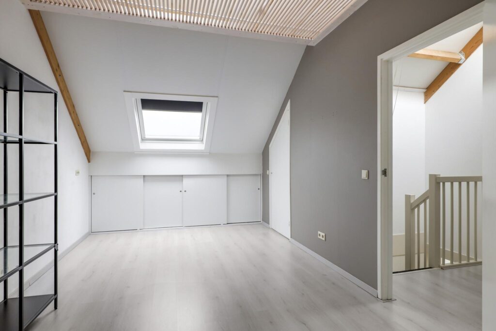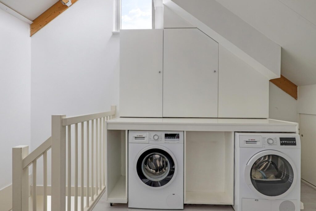 Vaak zien we dat de bovenste woonlaag nog een open ruimte betreft. Bij deze woning is de 2e verdieping al ingedeeld met een voorzolder met washoek, een royale slaapkamer (16m2, gemeten vanaf 1,5m hoogte) en een inloopkast. Onder de schuine dakvlakken zijn knieschot schuifpanelen geplaatst waar je de nodige spullen kunt opbergen. De washoek heeft een maatwerk kastenwand waarbij je de wasmachine en wasdroger onder een werkblad kunt plaatsen. Achter de kastdeurtjes kun je bijvoorbeeld wasmiddel uit het zicht opbergen. Ook is de CV-ketel achter één van de deurtjes weggewerkt.