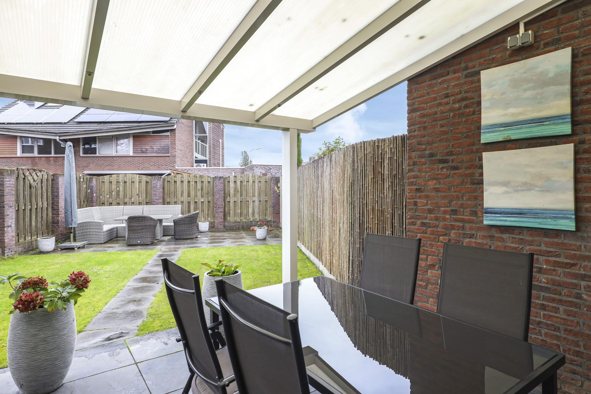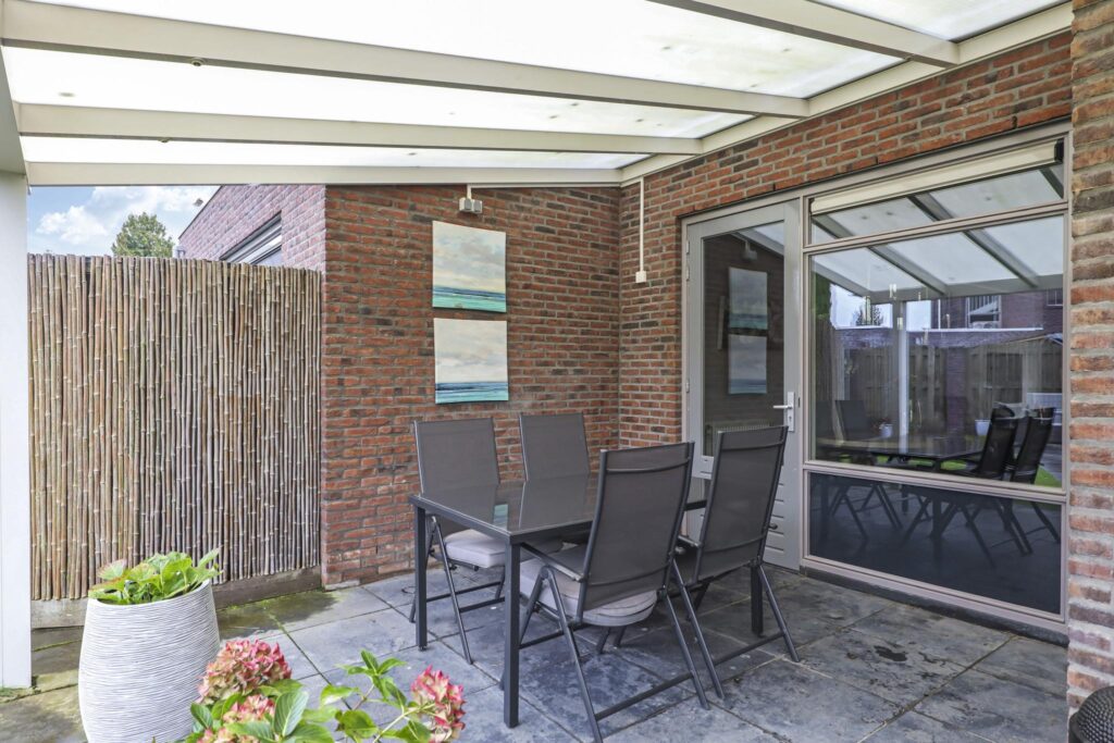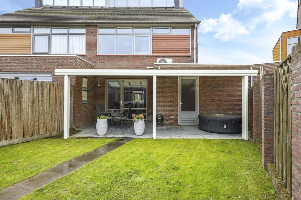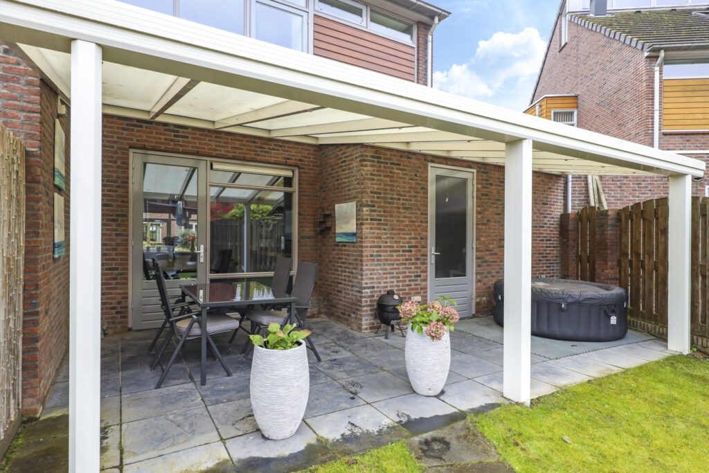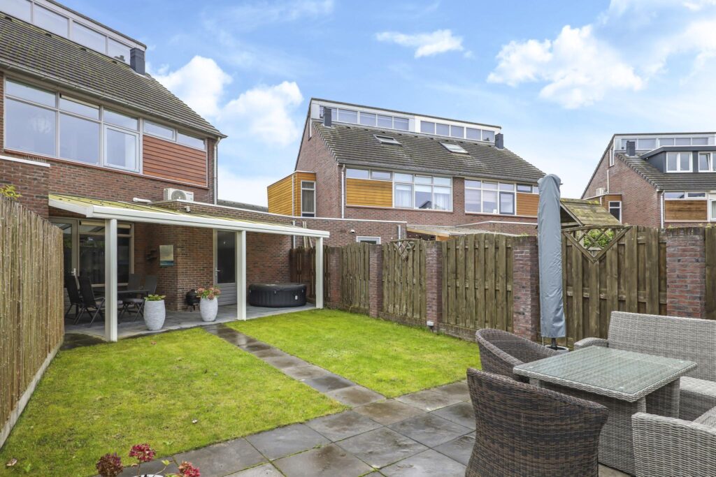 Bij een leuke gezinswoning, hoort ook een aantrekkelijke achtertuin. Deze tuin is zowel via de woonkamer (tuindeur) als via de garage toegankelijk. Je loopt bij beide deuren het buitenterras op welke over de volle breedte is overdekt middels een terrasoverkapping. Hier kun je gemakkelijk een lekkere loungeset en bijvoorbeeld een jacuzzi kwijt. Bovendien kun je hier door de overkapping het gehele jaar buiten zitten.