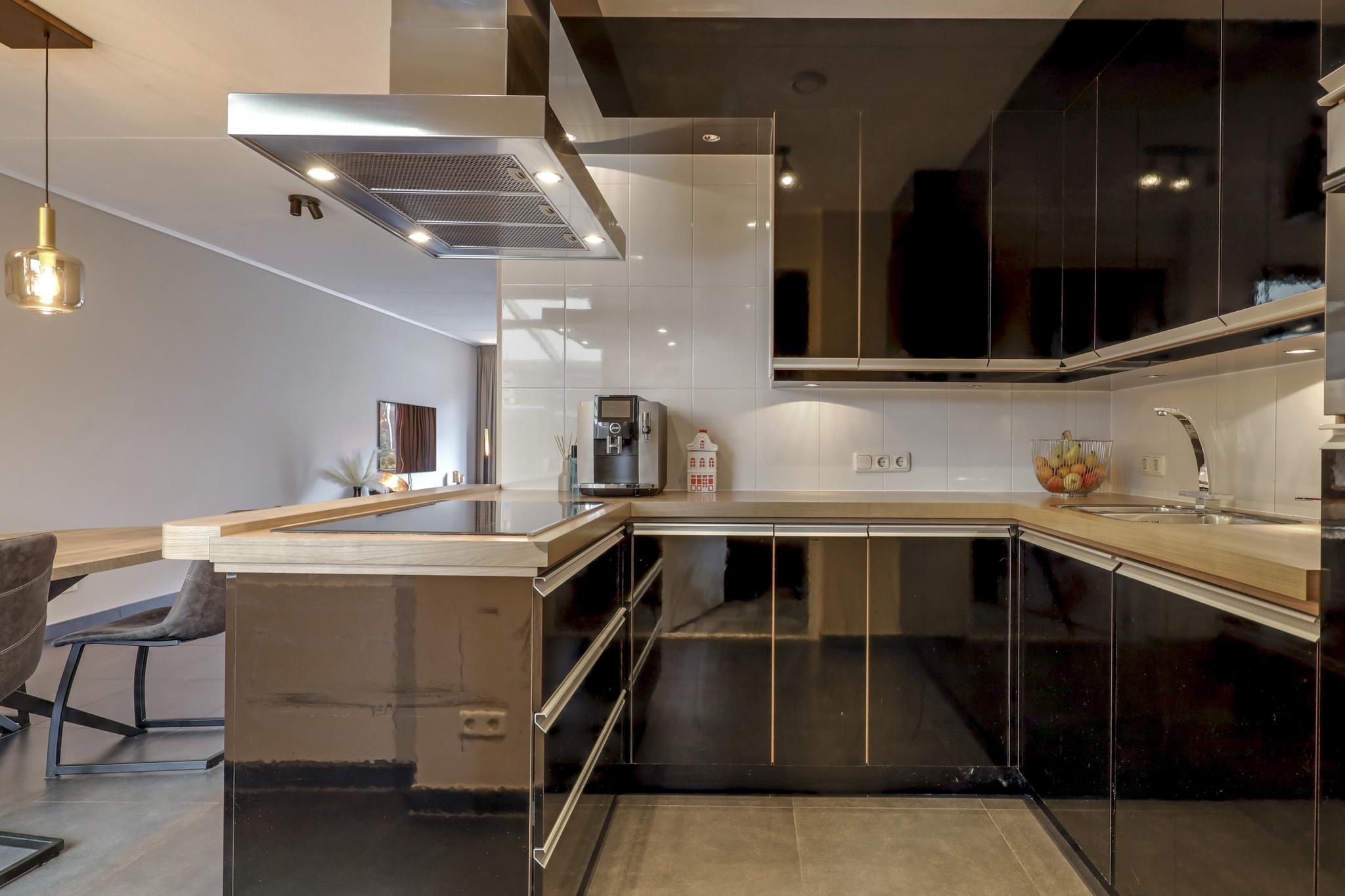 De keuken heeft een speels karakter doordat er voor een U-opstelling is gekozen. Het kookgedeelte heeft haar plek in het ‘schiereiland’ gekregen waardoor je tijdens het koken lekker van je afkijkt de woonkamer in. Koken doe je hier op een brede 4-pits keramische kookplaat waarbij een zwevende schouw (met inbouwspots) voor de afzuiging zorgt. De overige inbouwapparatuur bestaat uit een vaatwasser (2022), een combi-oven/magnetron en een koelkast. Wat verder opvalt is dat er veel kastruimte aanwezig is waaronder brede ladekorven, twee hoekkasten en meerdere bovenkasten.