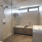 Luxe badkamer met whirlpool ligbad, een inloopdouche, 2e (zwevend) toilet en een breed 2-persoons wastafelmeubel.