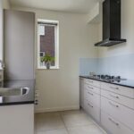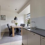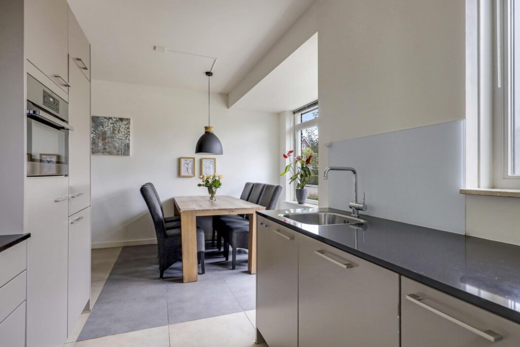 De keukenopstelling is speels met aan de ene zijde het kookgedeelte en de andere zijde het spoelgedeelte. De keuken heeft een moderne uitstraling met matte fronten en zwart granieten werkbladen. De inbouwapparatuur bestaat uit een vaatwasser, een 5-pits gaskookplaat met afzuigschouw erboven (2024), een koelkast, een separate vriezer (4 lades) en een combi-oven/magnetron.