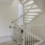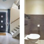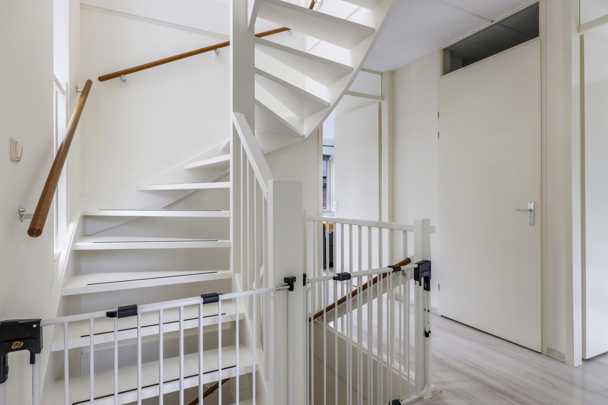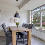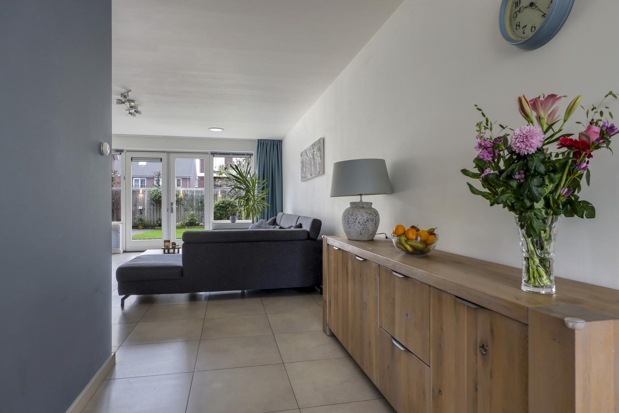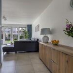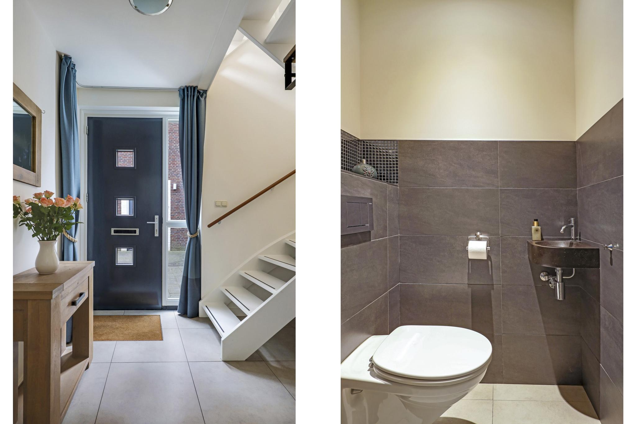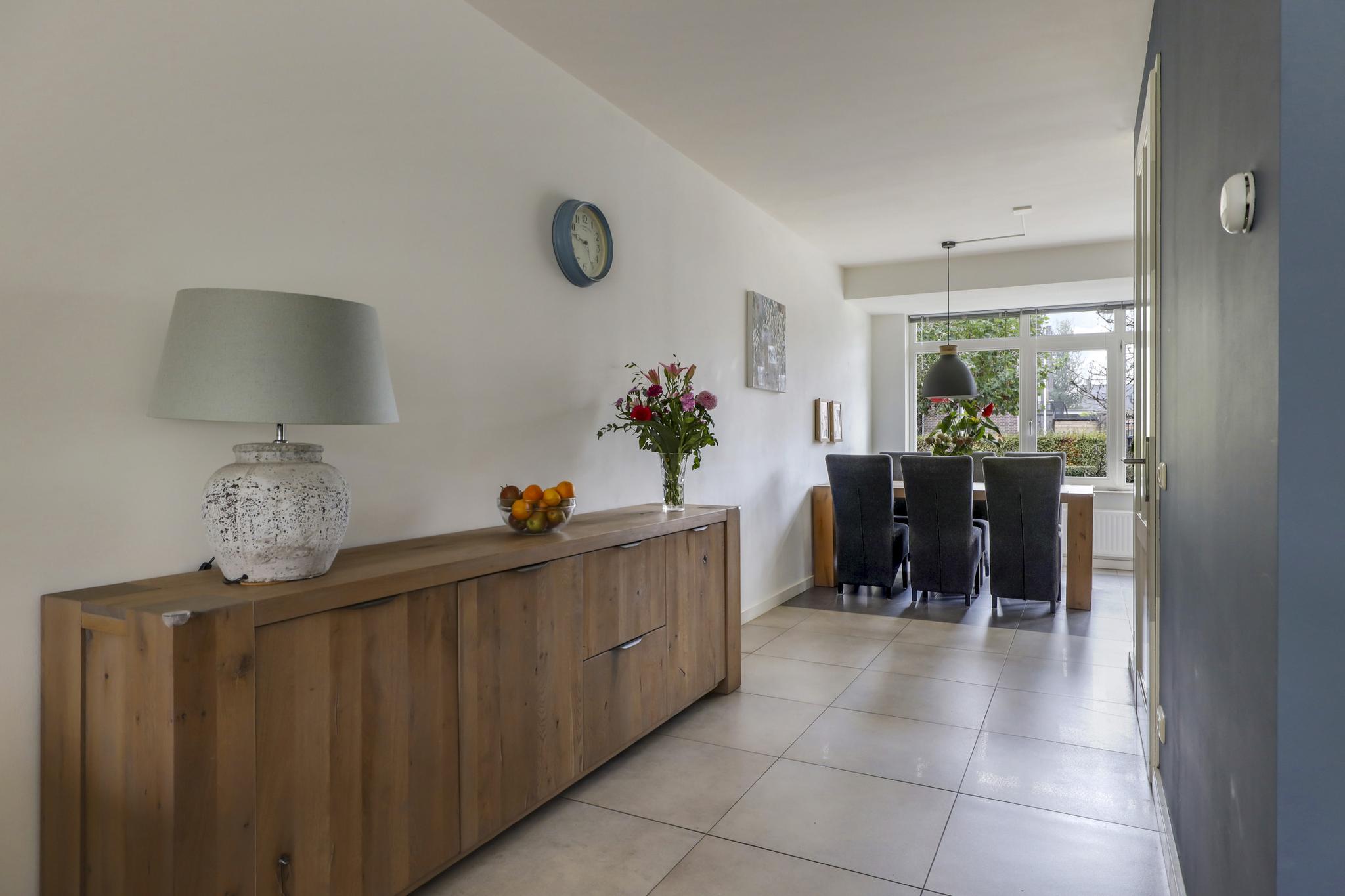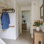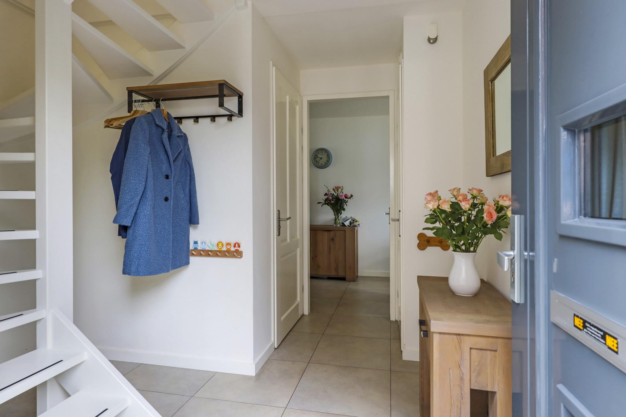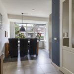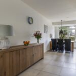 Het is hier prettig binnen komen in de hal. Doordat de trapopgang ruimer is opgezet, is er onder de trap voldoende ruimte voor een garderobe en bijvoorbeeld een kinderwagen. De tussendeur met de woonkamer is vervangen door een luxe deur met glaspanelen.