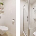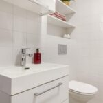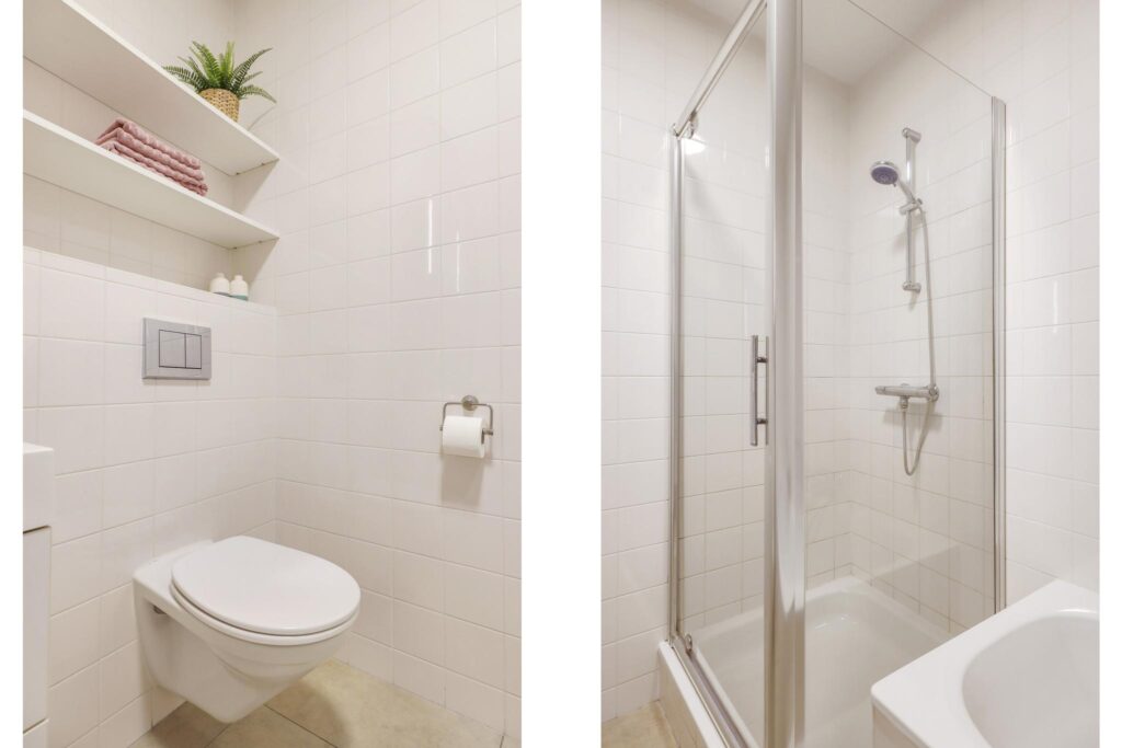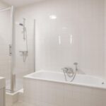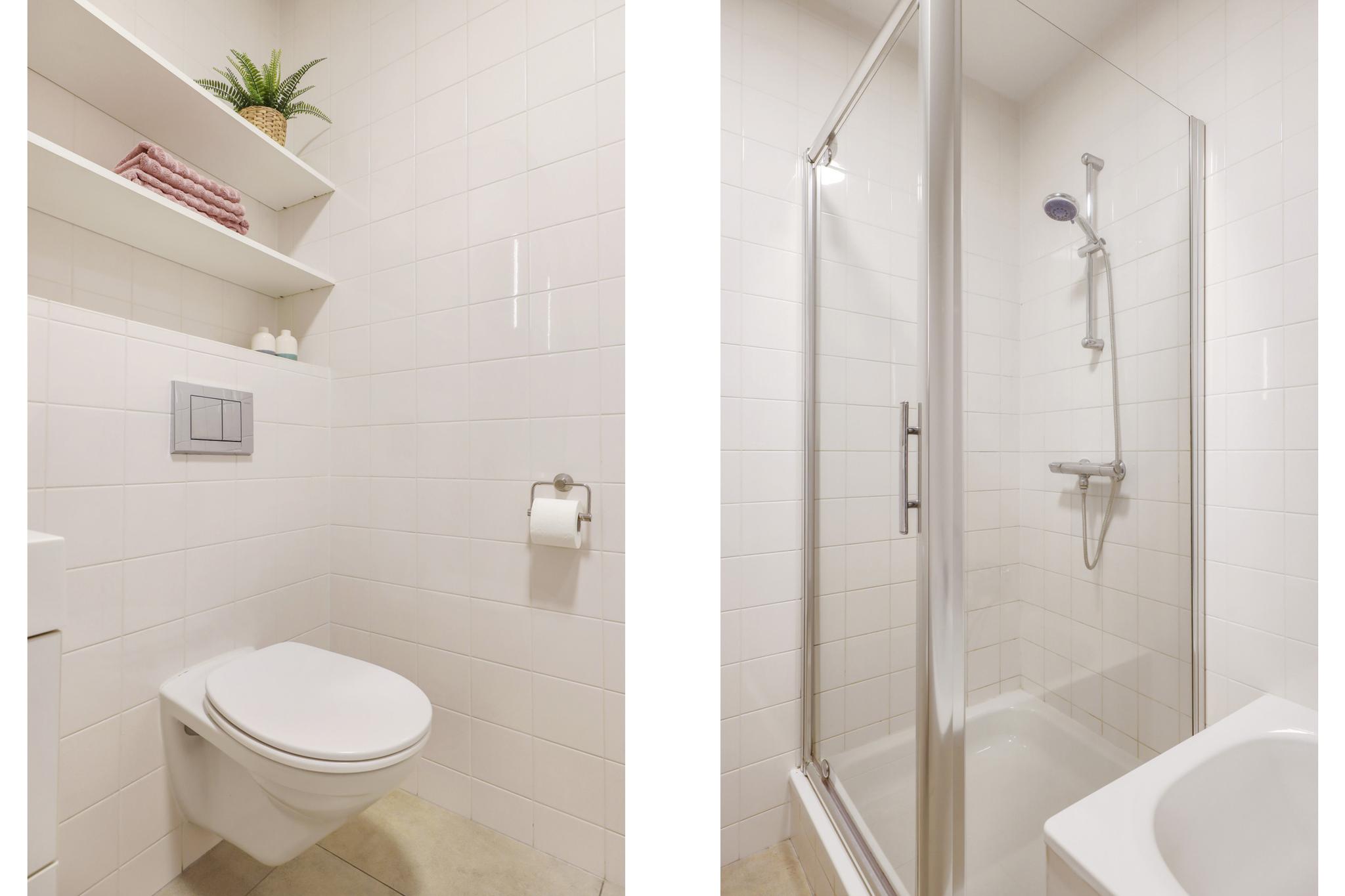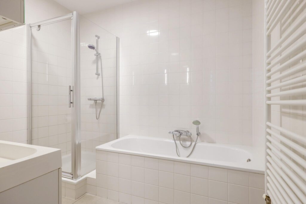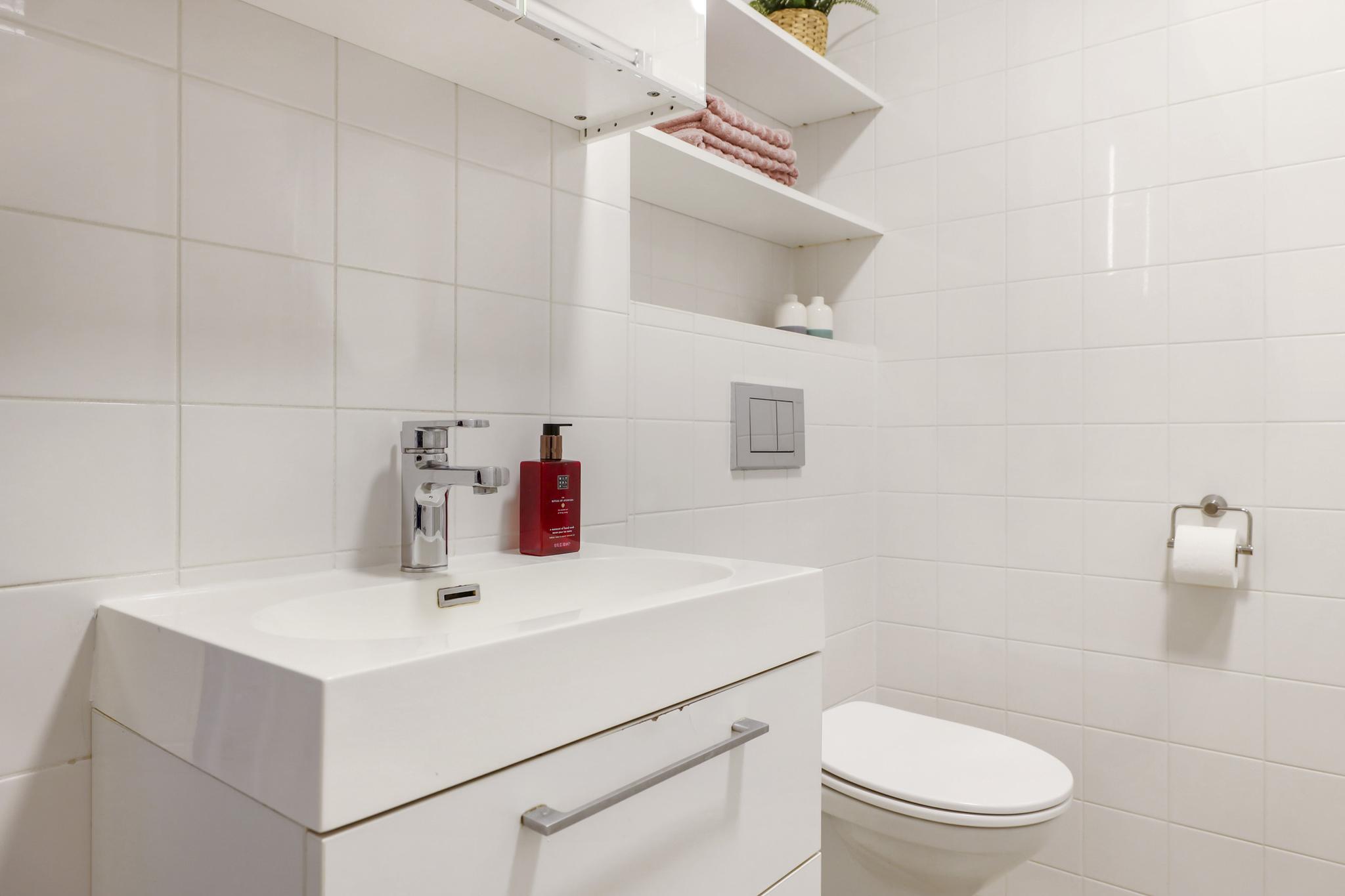 De badkamer is niet overdreven luxe aangekleed maar wel degelijk en neutraal afgewerkt. Dit zie je terug in bijvoorbeeld neutraal tegelwerk dat tot aan het plafond is aangebracht. De ruimte is compleet ingedeeld met een douchecel, een ligbad, een wastafelmeubel met spiegelkast erboven en een 2e (zwevend) toilet. Een handdoekradiator maakt de badkamer compleet.