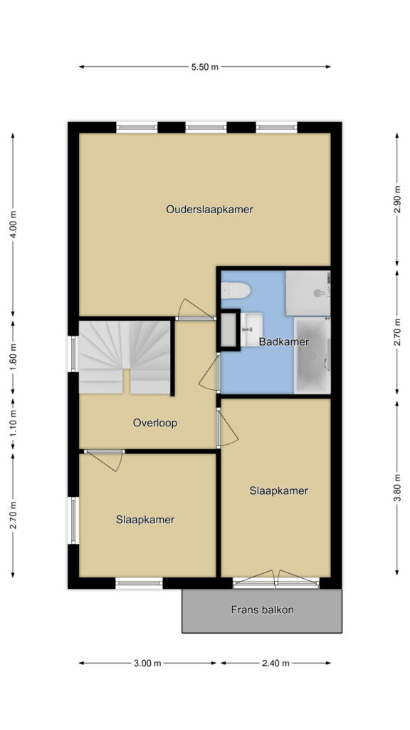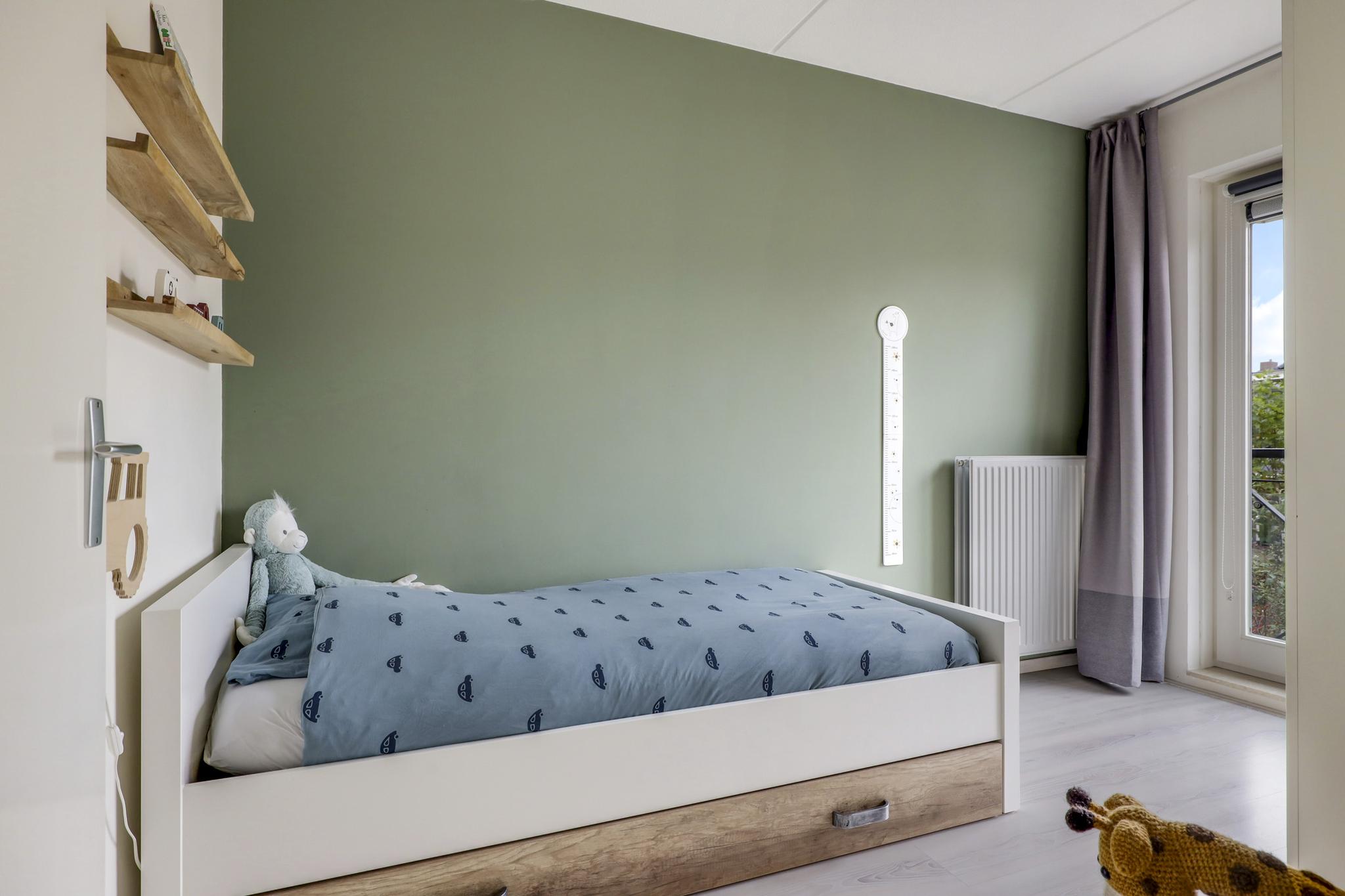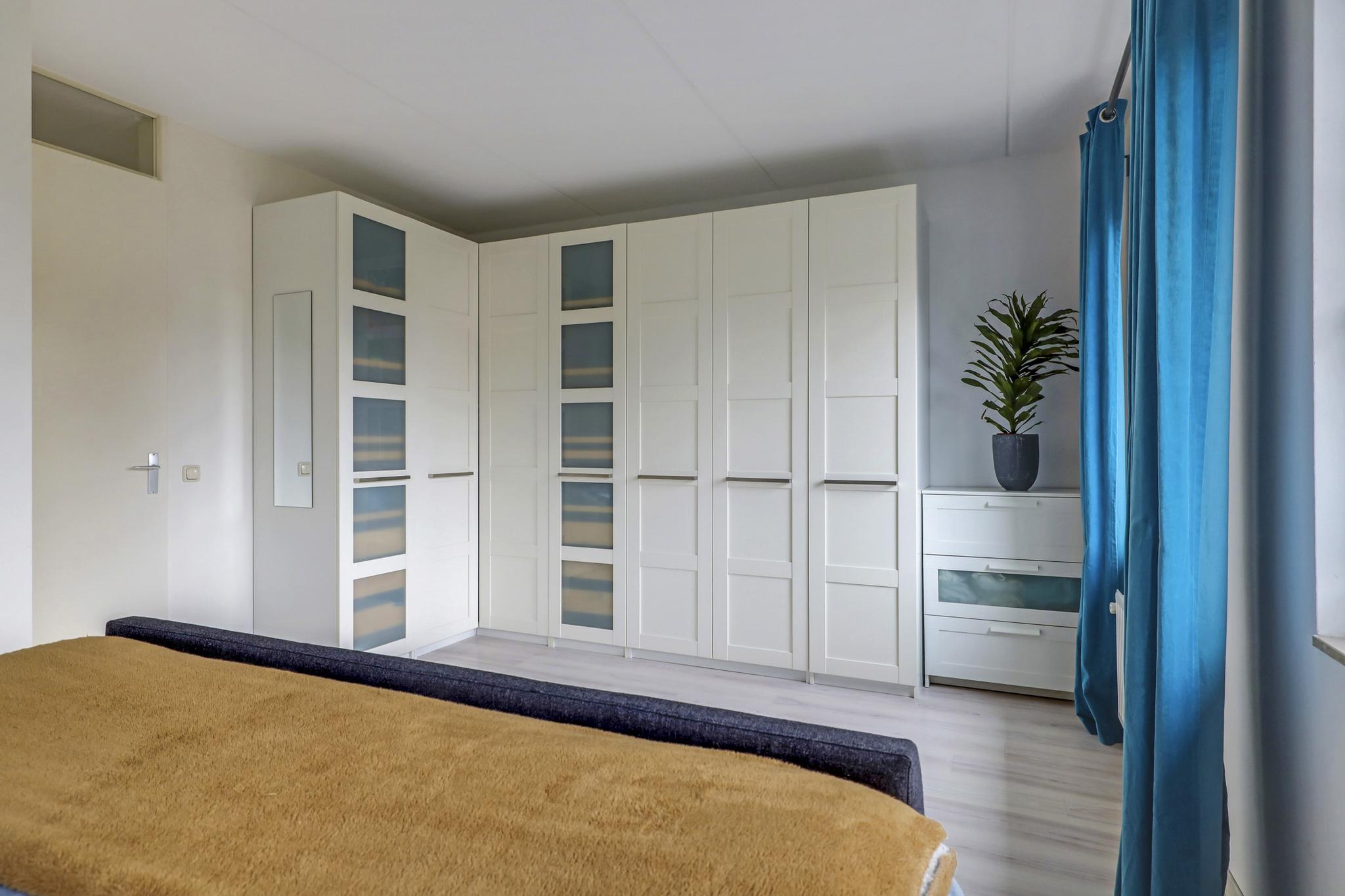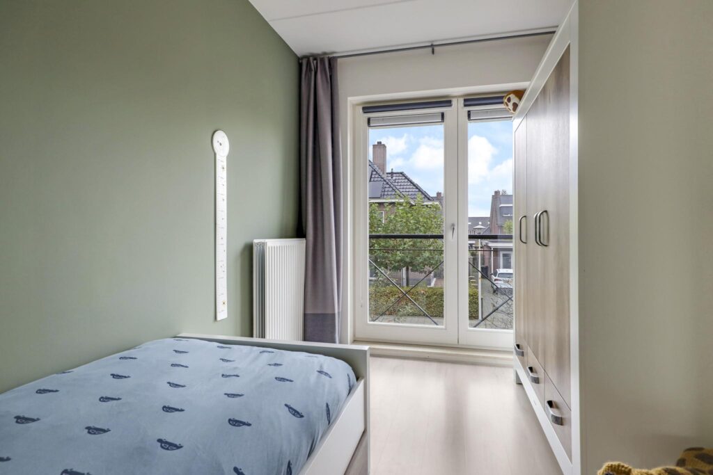 Via een comfortabele, wit geschilderde trapopgang bereiken we de 1e verdieping. Deze woonlaag is ingedeeld met 3 volwaardige slaapkamers en de badkamer. De slaapkamers zijn respectievelijk 19m2, 9m2 en 8m2 groot waarbij het wel duidelijk is welke de masterbedroom betreft. Dit is de slaapkamer aan de achterzijde die over de volle breedte van de woning is gesitueerd. Hierdoor hoef je niet te twijfelen of dat een groot 2-persoons bed én een linnenkast wel past. Eén van de slaapkamers aan de voorzijde heeft een Frans balkon die je wagenwijd kunt open zetten doordat het dubbele deuren heeft. Hierdoor is het heel verleidelijk om regelmatig je dekbed over de balustrade uit te laten waaien.