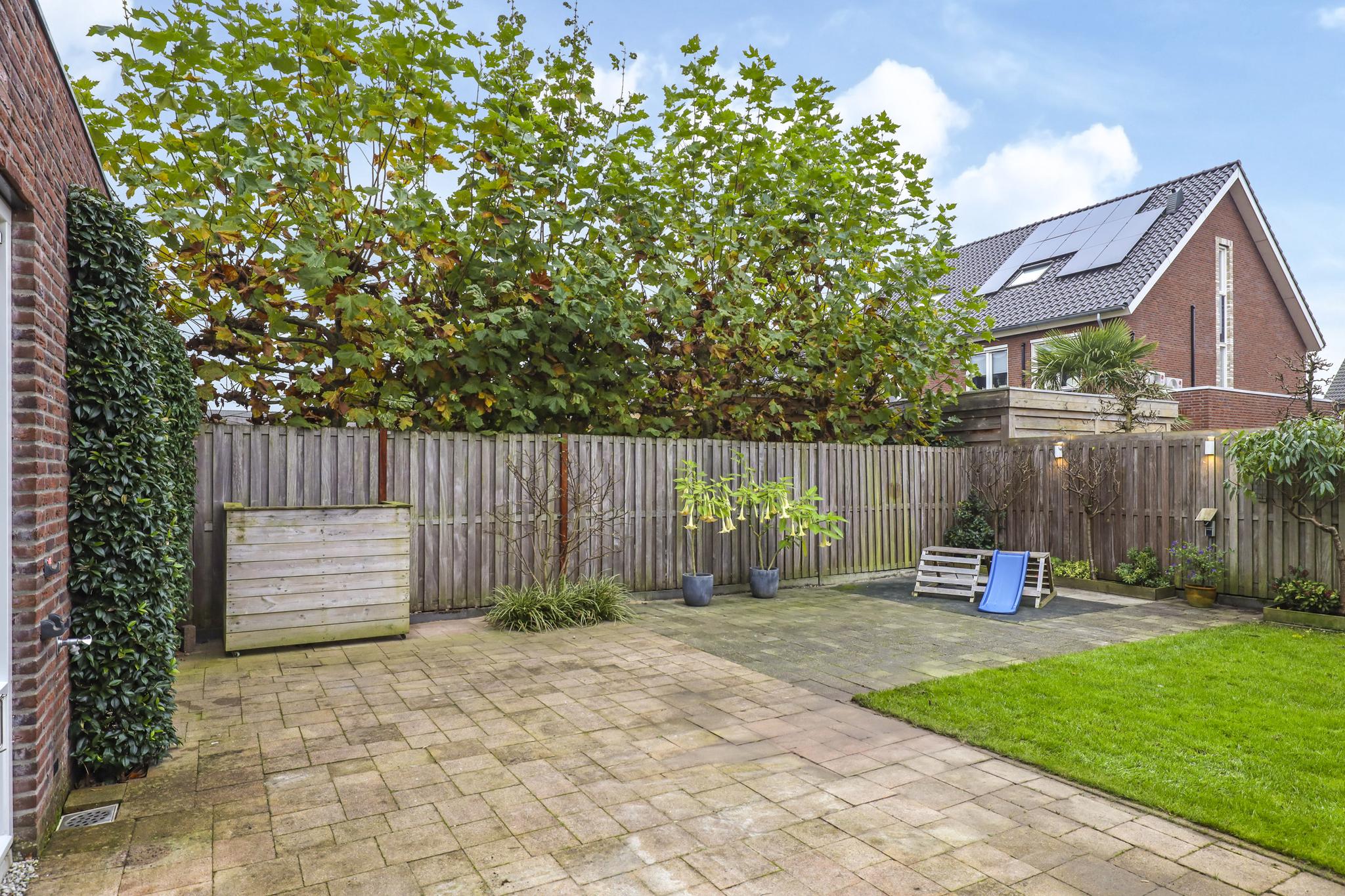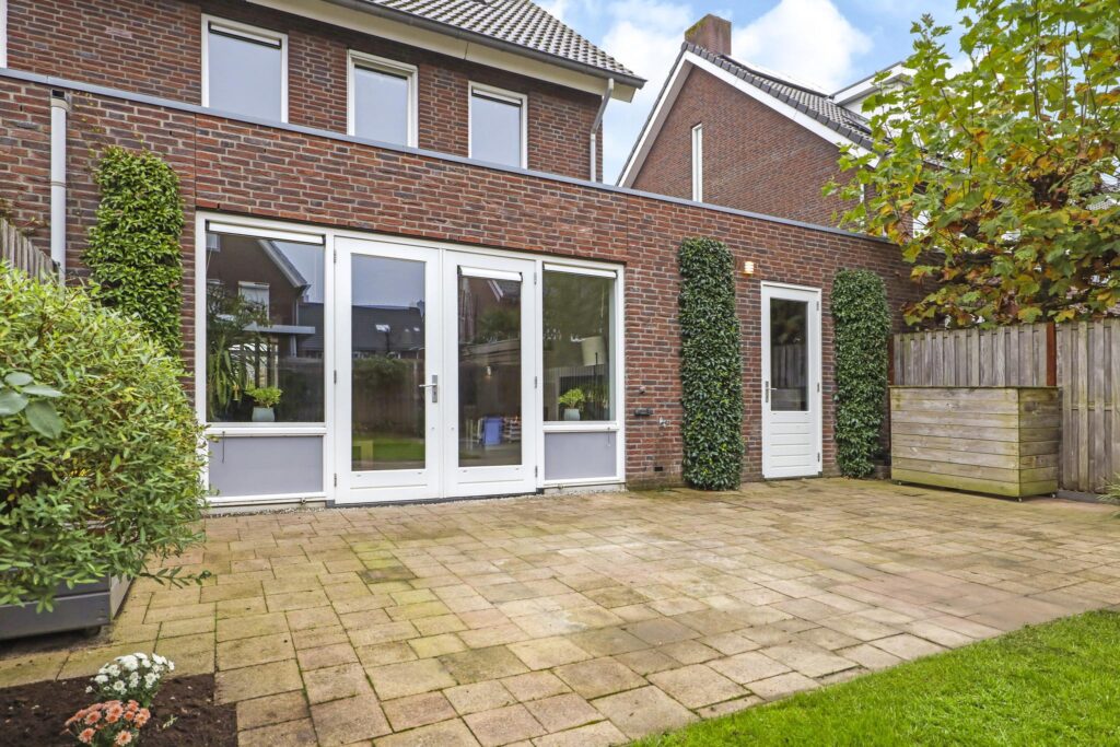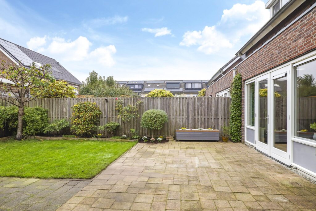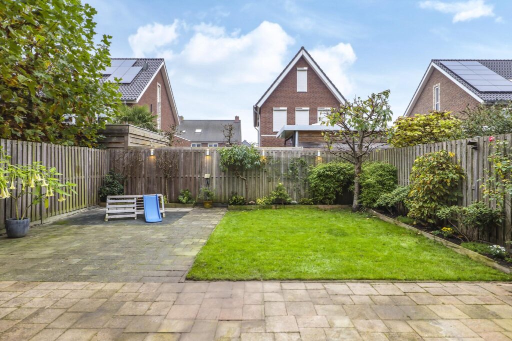 De achtertuin van deze woning heeft een mooi formaat (11m diep en 9m breed) waardoor je er veel kanten mee op kunt. De tuin is aangelegd met een groot terras en een grasgazon. Het terras biedt volop mogelijkheden om er een lekkere tuinset te plaatsen. En doordat de tuin een gunstige ligging heeft op de zon (westen), geniet je hier een belangrijk deel van de dag veel zonuren. In de ochtend staat de zon al achterin de tuin en gaande weg de dag schijnt de zon steeds meer in de tuin (tot in de avonduren). Het valt op de foto’s bijna niet op maar langs de erfafscheidingen (schuttingen) zijn meerdere boompjes gepland waarbij de kersenboom het meest in het oog springt.