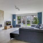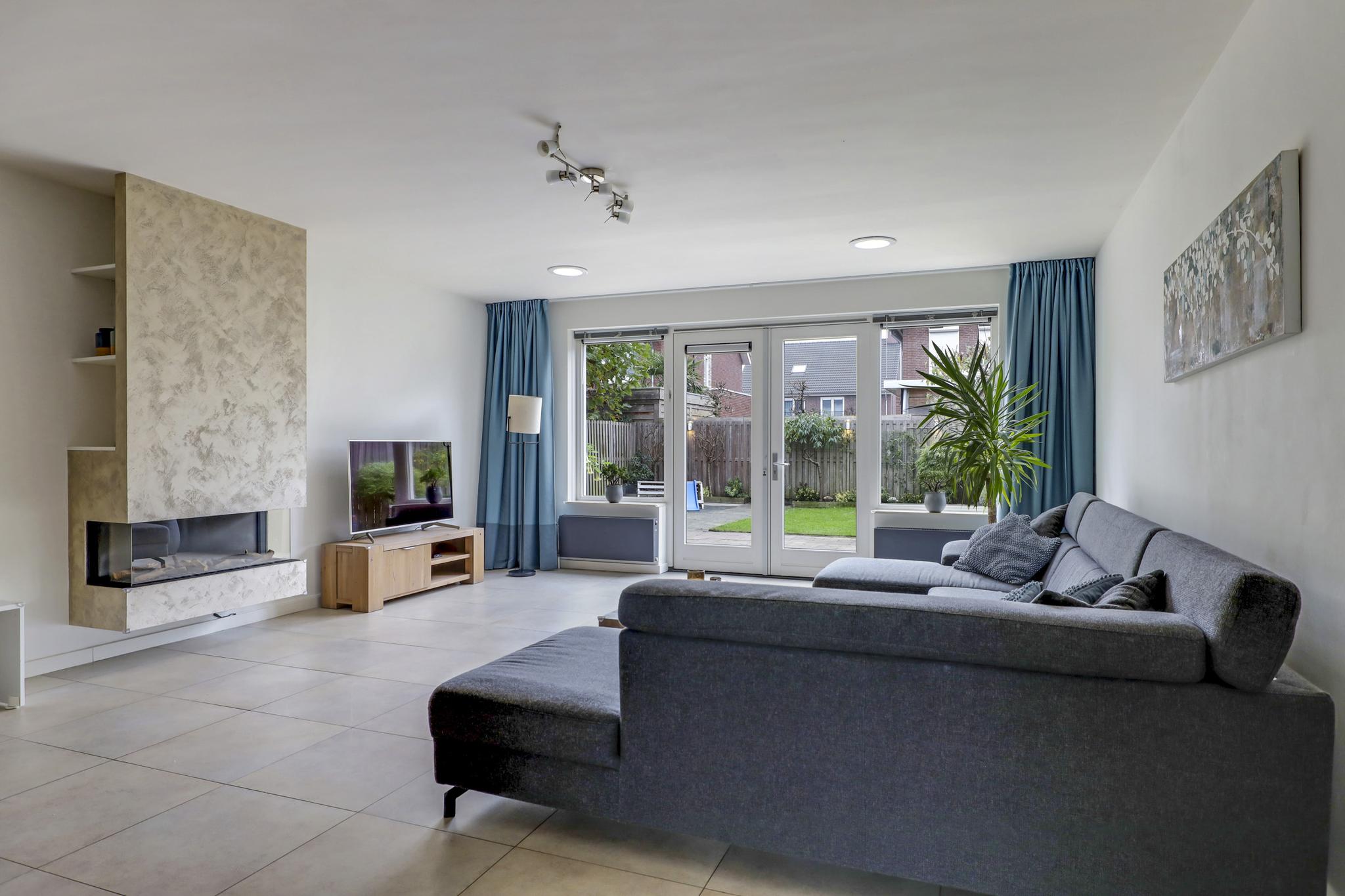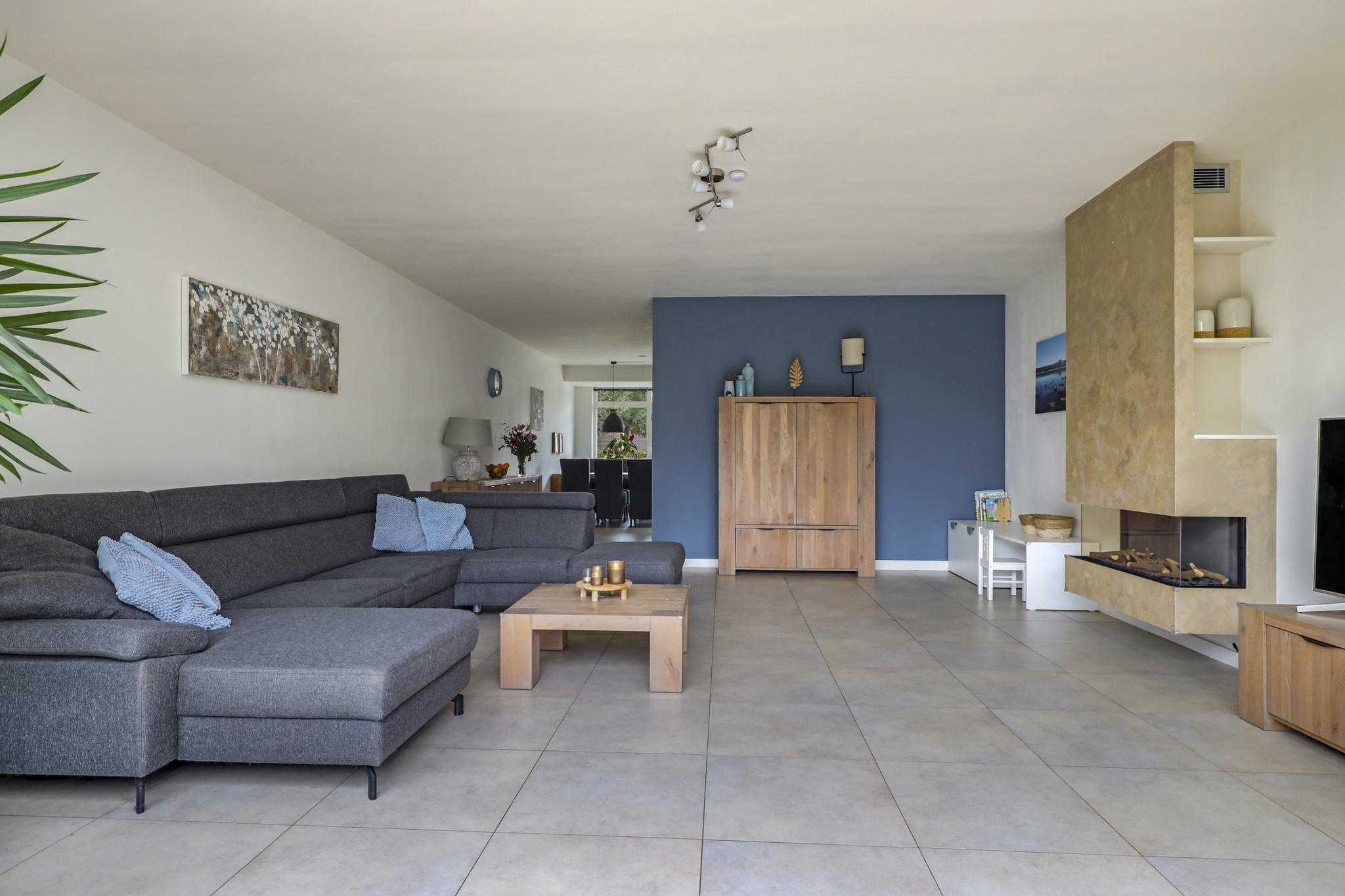 Uitgebouwde woonkamer met ingebouwde gashaard en dubbele terrasdeuren