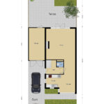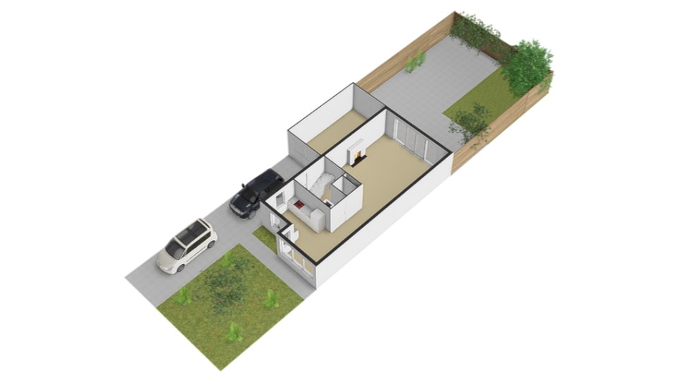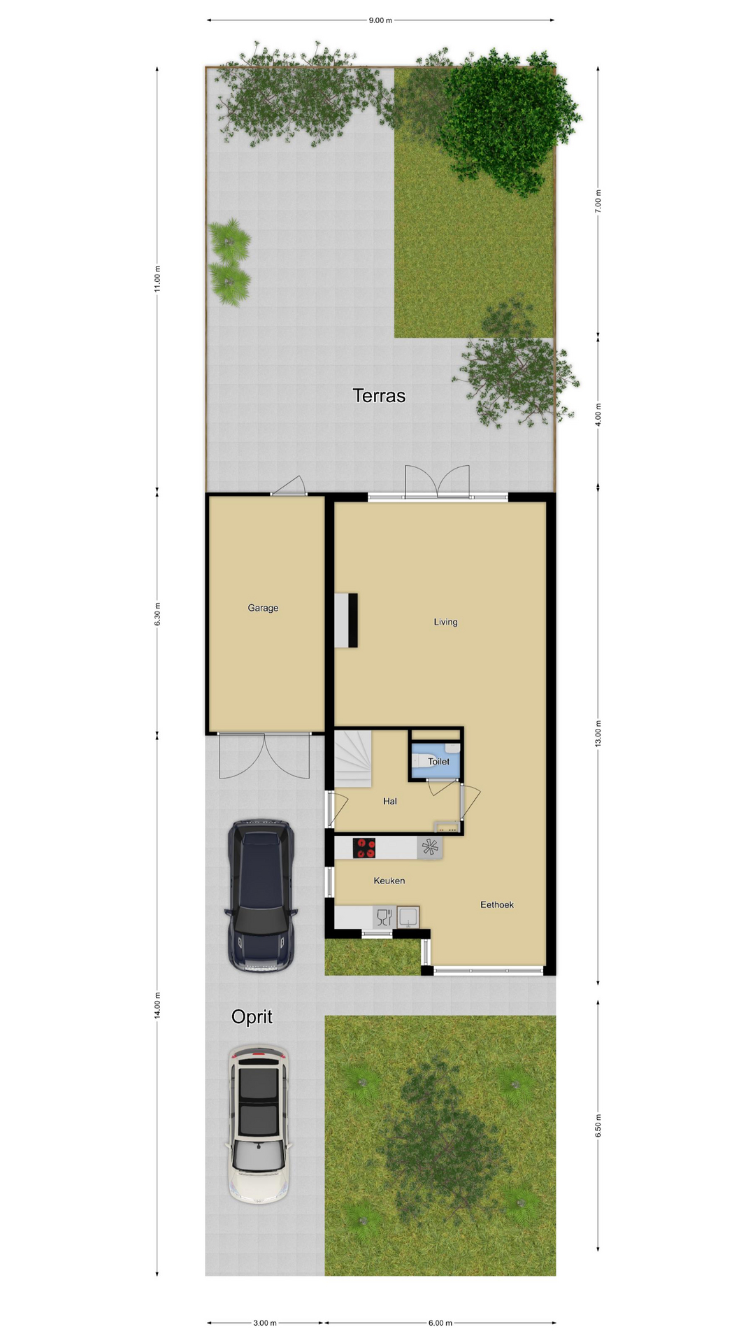 Vóór de garage ligt een relatief diepe oprit (14 meter lang). Hierdoor kun je met gemak 2 auto’s achter elkaar op eigen terrein parkeren.
