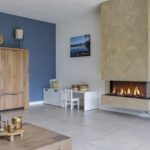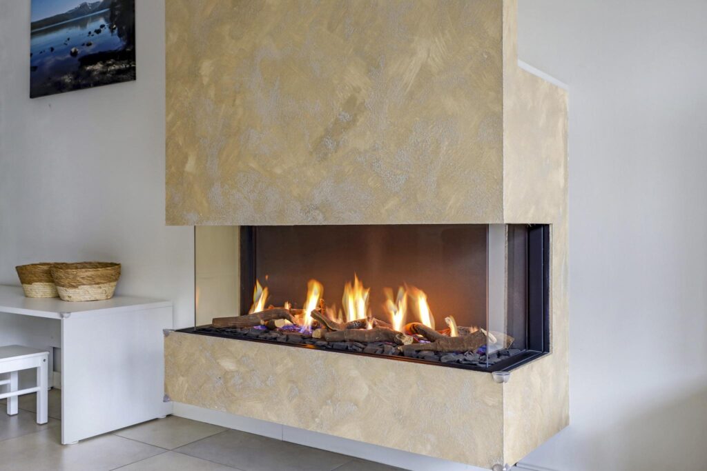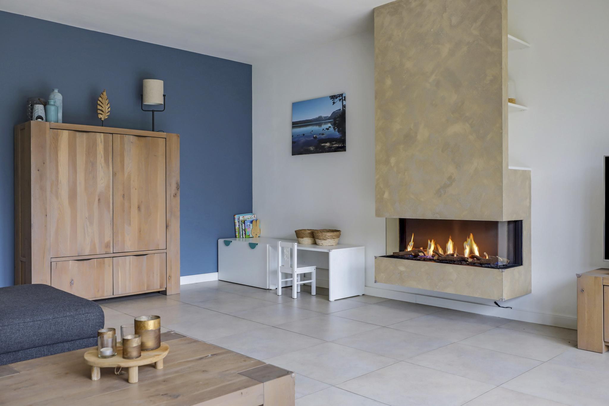 Een echte eye-catcher is de brede gashaard die zwevend en centraal in de woonkamer is geplaatst. De gashaard heeft zelfs aan de zijkanten glas waardoor je de vlammetjes vanuit elke hoek kunt zien. Daarbij komt dat er aan beide kanten nisjes zijn aangebracht waar je bijvoorbeeld boeken of andere accessoires in kunt zetten.