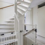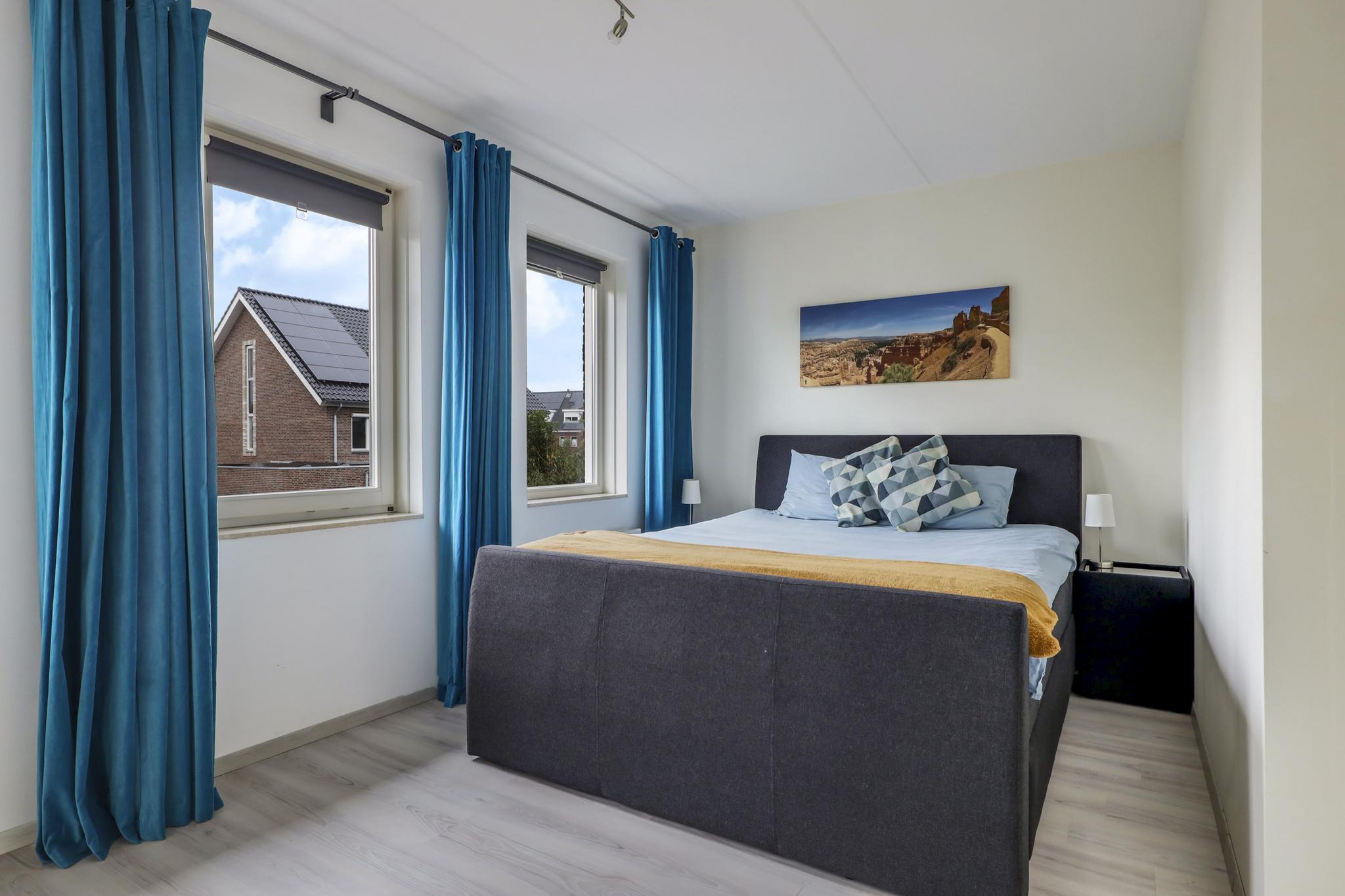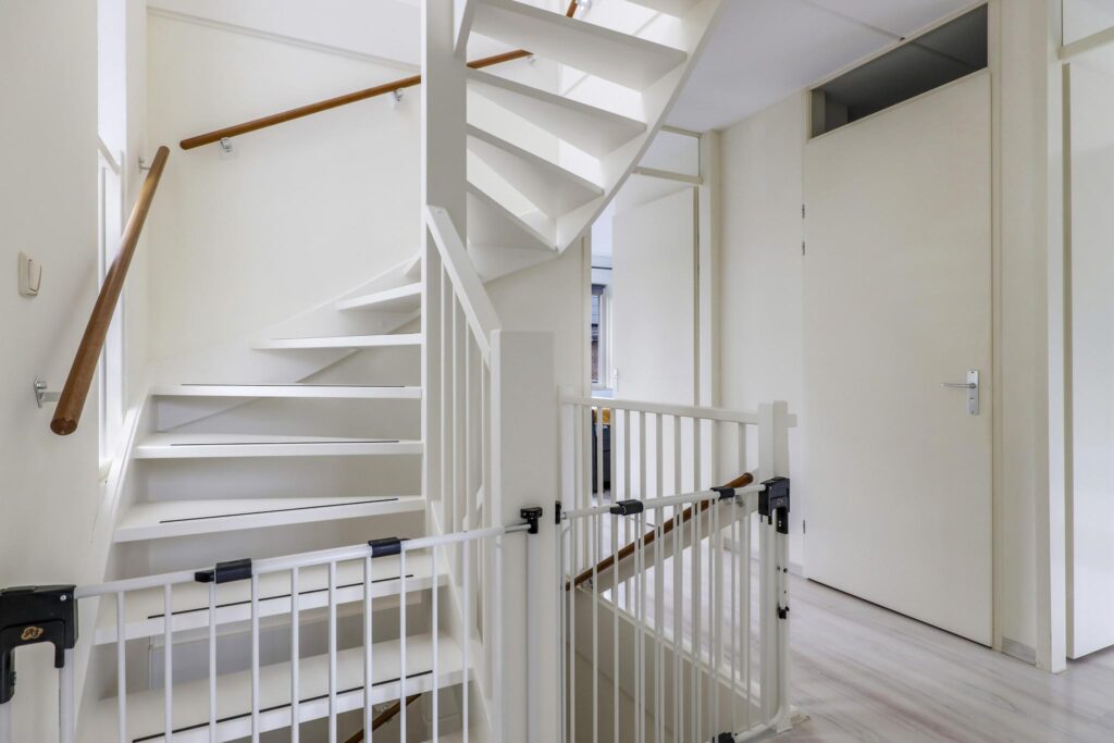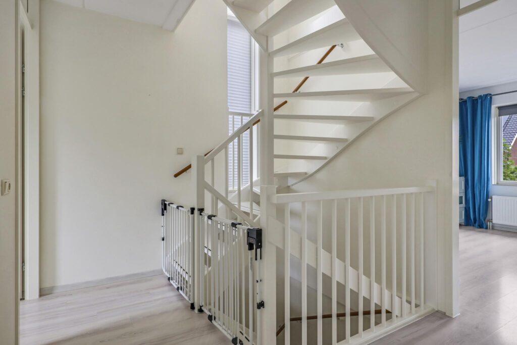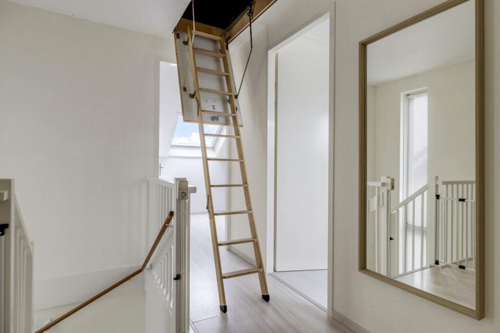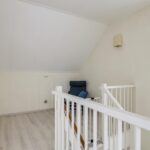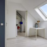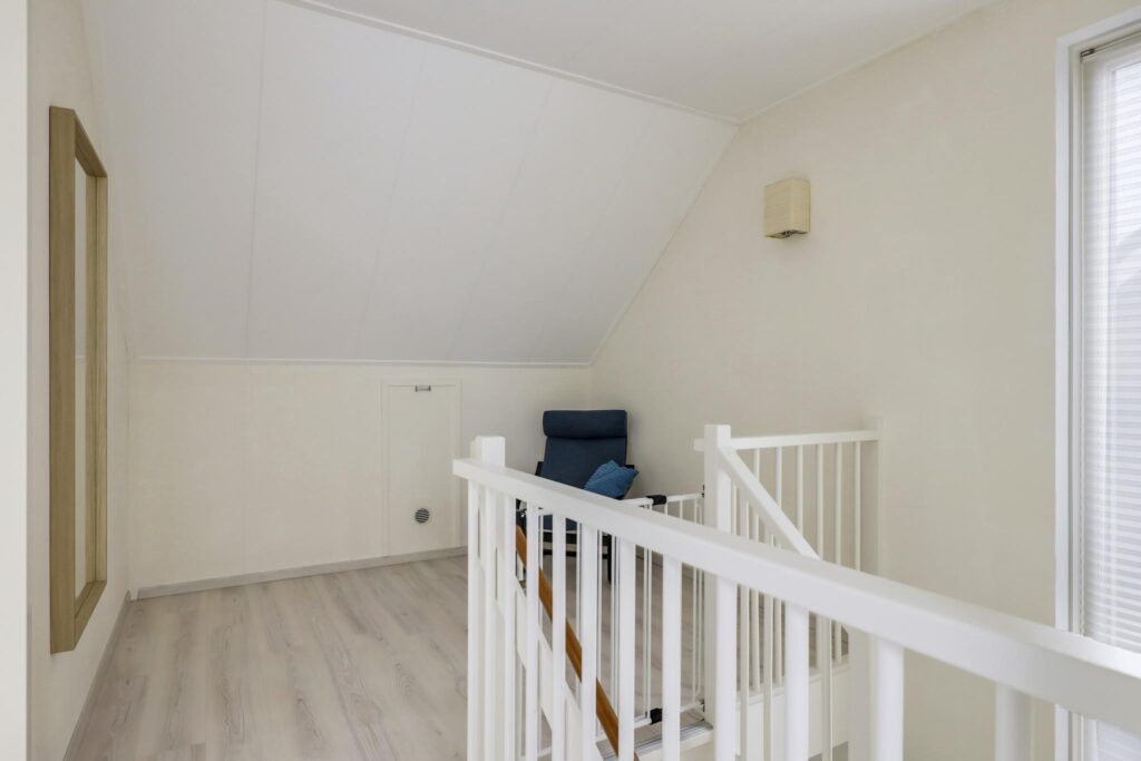 In het verlengde van de 1e trapopgang lopen we door naar de 2e verdieping waarbij het zijgevelraam voor een aangename lichtinval zorgt. De 2e verdieping is met recht een verrassing te noemen. Van oorsprong betreft dit een open ruimte met 4 meter hoge nok, maar in dit geval is deze woonlaag opgedeeld in 2 aantrekkelijke slaapkamers en een separate wasruimte. Bovendien is de overloop nog dermate ruim dat je er bijvoorbeeld een studiehoek zou kunnen creëren. Een vlizotrap geeft toegang tot de zoldervliering. Hier kun je veel (seizoen)spullen opbergen. De aanwezige verlichting is met name een praktisch aspect.