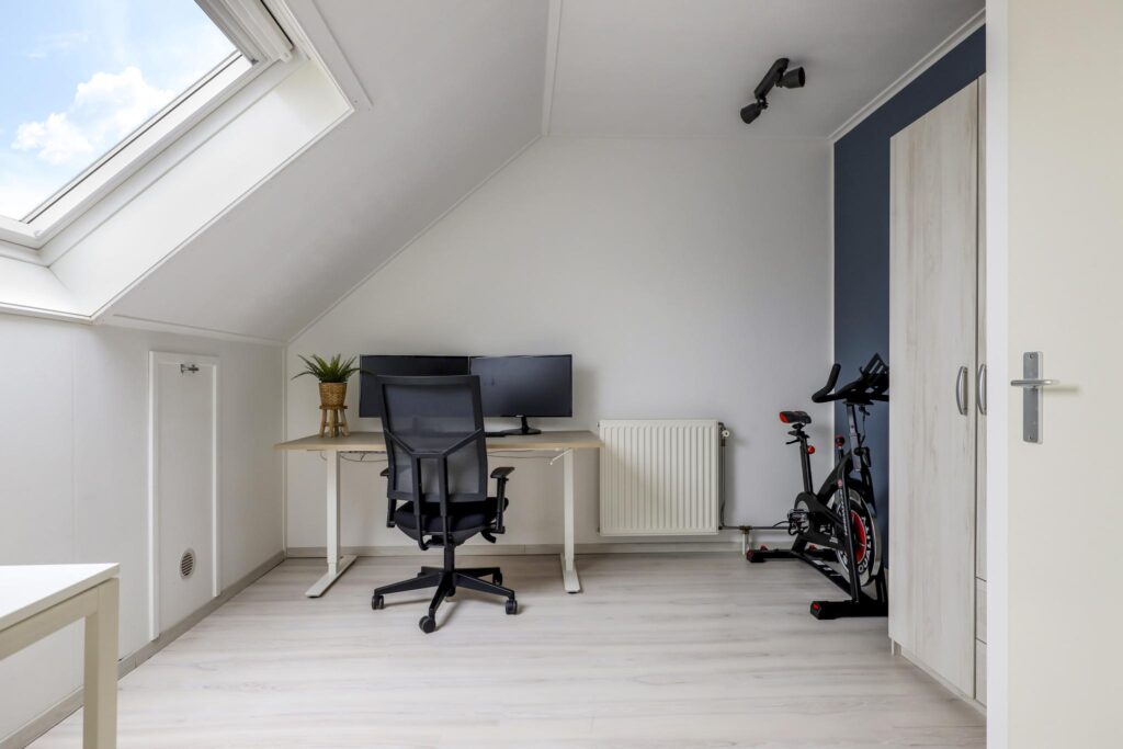 De 4e en 5e (slaap)kamer zijn respectievelijk 10m2 en 7m2 groot, maar eigenlijk zijn ze nog groter aangezien de maatvoering is gemeten vanaf 1,5 meter hoogte. Beide slaapkamers zijn bovendien voorzien van een groot Velux dakvenster met verduisteringsscherm. Hierdoor kun je de kamers 100% donker maken. Onder de schuine dakvlakken zijn nog knieschotten aangebracht waar je de nodige spullen kunt opbergen. Werk je veel vanuit huis, dan zou je één van de kamers ook kunnen inrichten als werkkamer.
