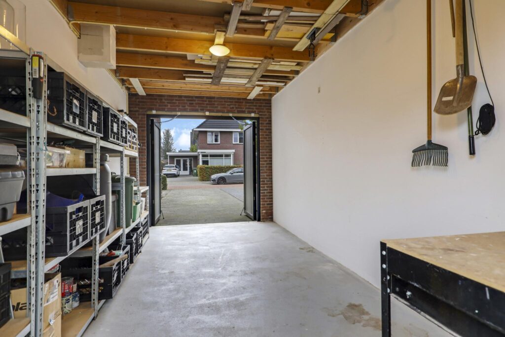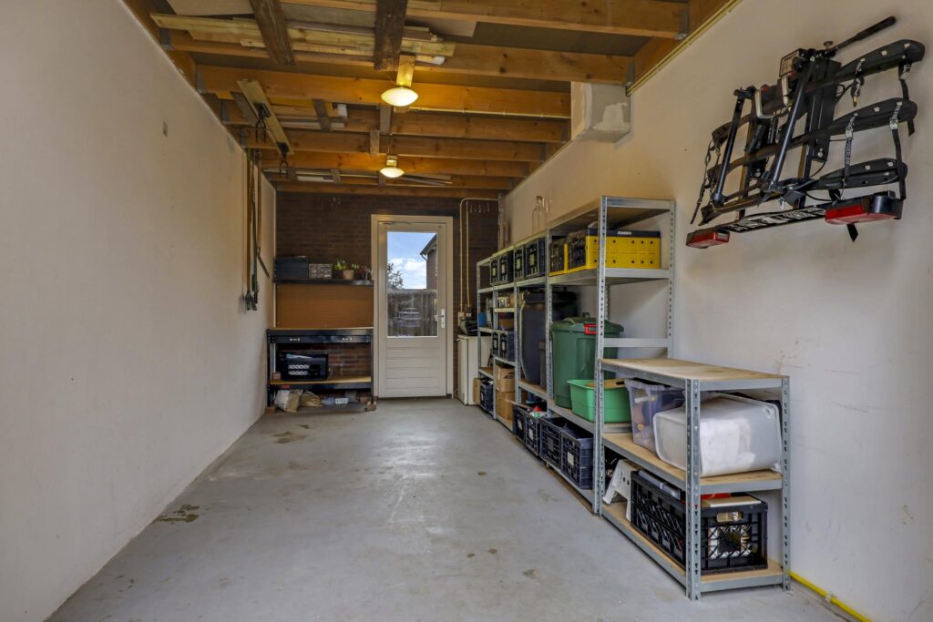 Naast de woning is een stenen garage opgetrokken. Deze garage is met een lengte van iets meer dan 6 meter en 3 meter hoogte lekker ruim te noemen. Vanuit de bouw werd de garage opgeleverd met een stalen kanteldeur. In 2020 is ervoor gekozen om deze kanteldeur te vervangen door geïsoleerde, dubbele deuren. Hierdoor is de garage niet alleen beter geïsoleerd, maar ook beter toegankelijk. Bovendien ziet het er aan de voorzijde net even iets stijlvoller uit. Een auto rijden we tegenwoordig niet snel meer de garage in, maar het is een ideale stallingsruimte voor meerdere (elektrische) fietsen, misschien wel een bakfiets en/of een motor. Daarnaast hou je nog ruimte over voor bijvoorbeeld een werkbank.