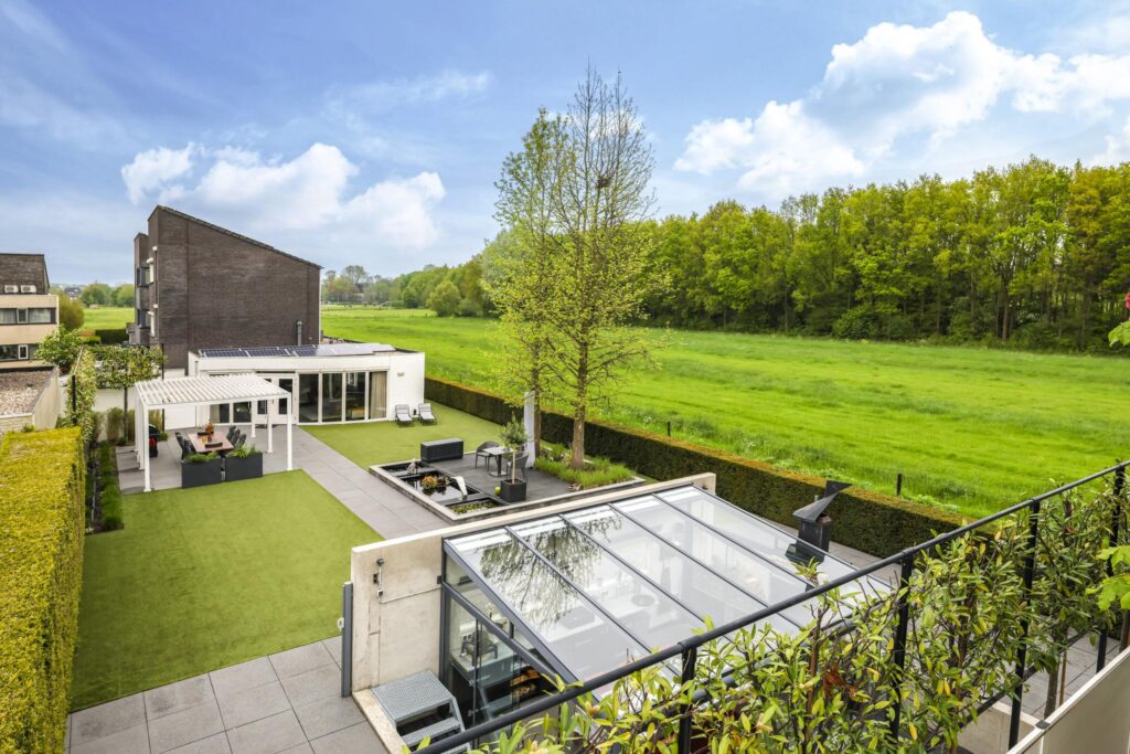 Misschien is het grootste pluspunt wel de uitzonderlijk vrije ligging aan de rand van het dorp. Hierdoor geniet je een panoramisch vrij uitzicht over de weilanden waar doorgaans paarden lopen. Om die reden zijn er ook meerdere terrassen aangelegd, waaronder een verhoogd terras met vijverpartij en aan de zijkant van de woning een terras met overkapping (6×4) en een ‘wellnesshoek’ met buitendouche en jacuzzi (de laatste wordt ter overname aangeboden). Kunstgras geeft de tuin een onderhoudsarm karakter.