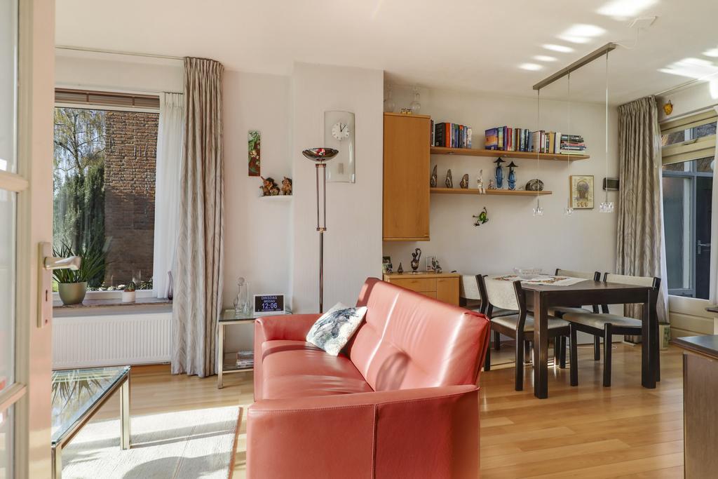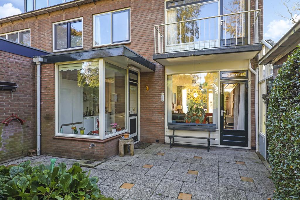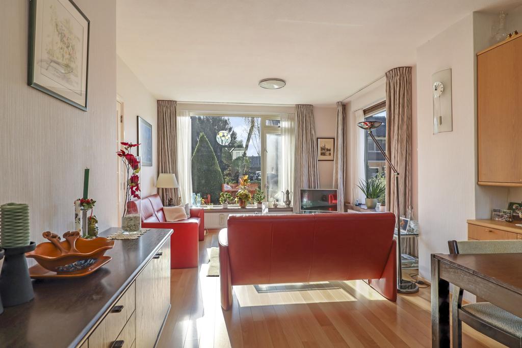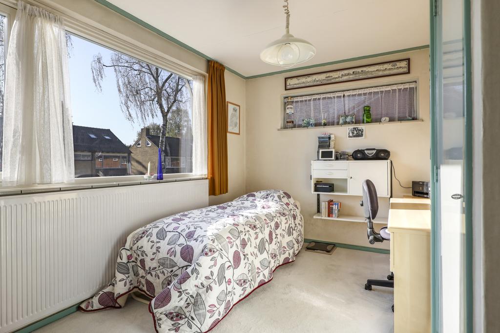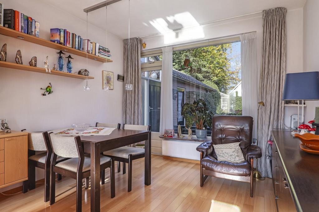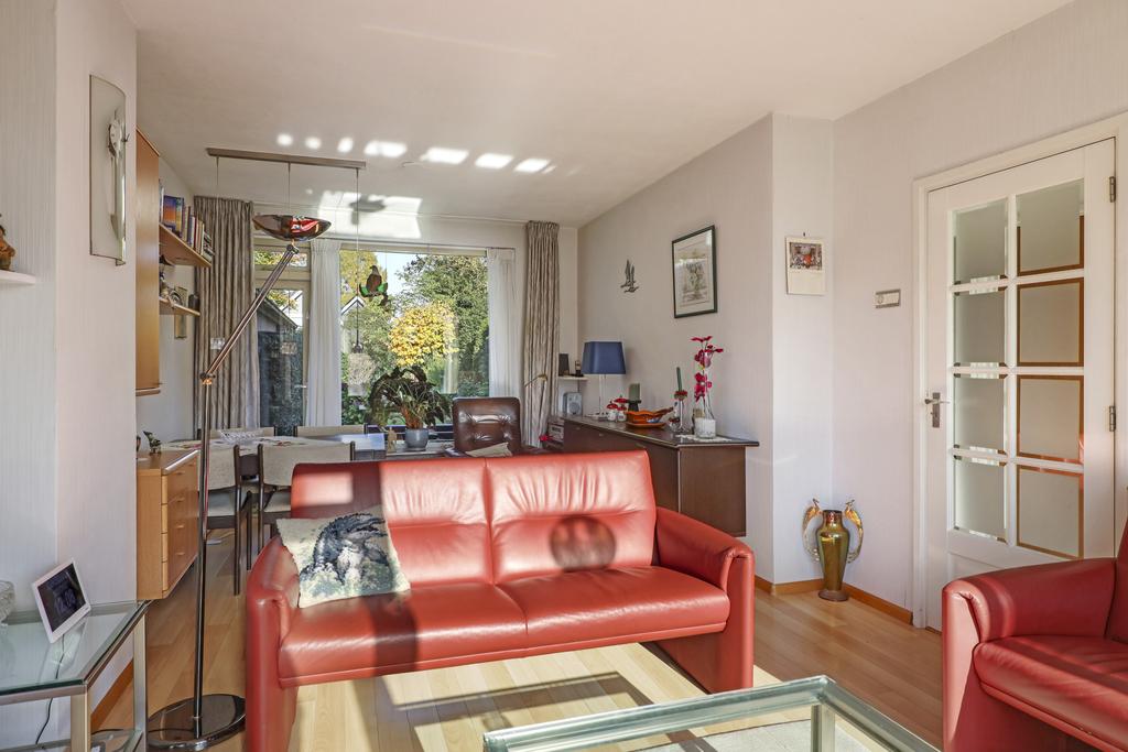 Je kent het vast wel: de doorzon-woonkamer. In de jaren 50 tot en met 70 was dit de klassieke indeling waarbij grote ramen in de voor- en achtergevel voor veel zonnewarmte moesten zorgen. Maar bovenal zorgt het voor veel lichtinval en als je geluk hebt ook een fraai uitzicht in de voor- en achtertuin. Deze woning heeft het allemaal, zelfs een zijgevelraam. Met 7 meter voortuin en nog een groenstrook achter het voetpad kijk je niet direct op de straat. Aan de achterzijde kijk je vanaf de bank eveneens vrij het groen van de achtertuin in. Het geeft een bepaald vrijheidsgevoel. Er is een rookkanaal aanwezig (nooit gebruikt) waar je wellicht een gezellige kachel op kunt aansluiten. Een tuindeur in de achterpui geeft direct toegang tot het buitenterras.
