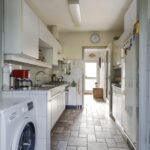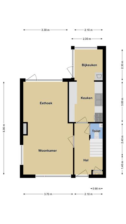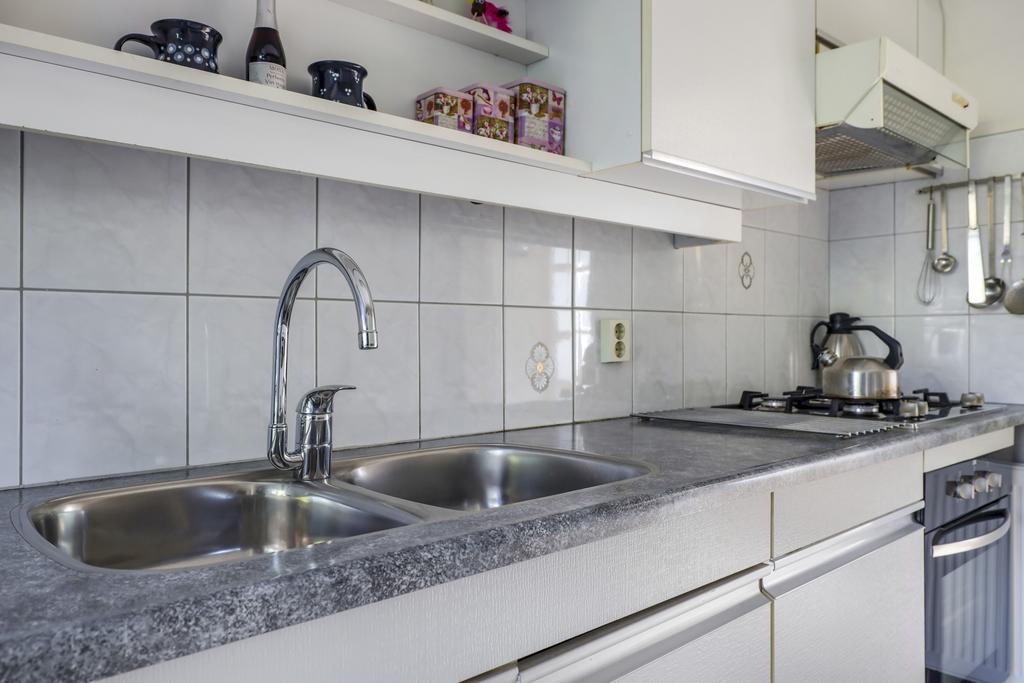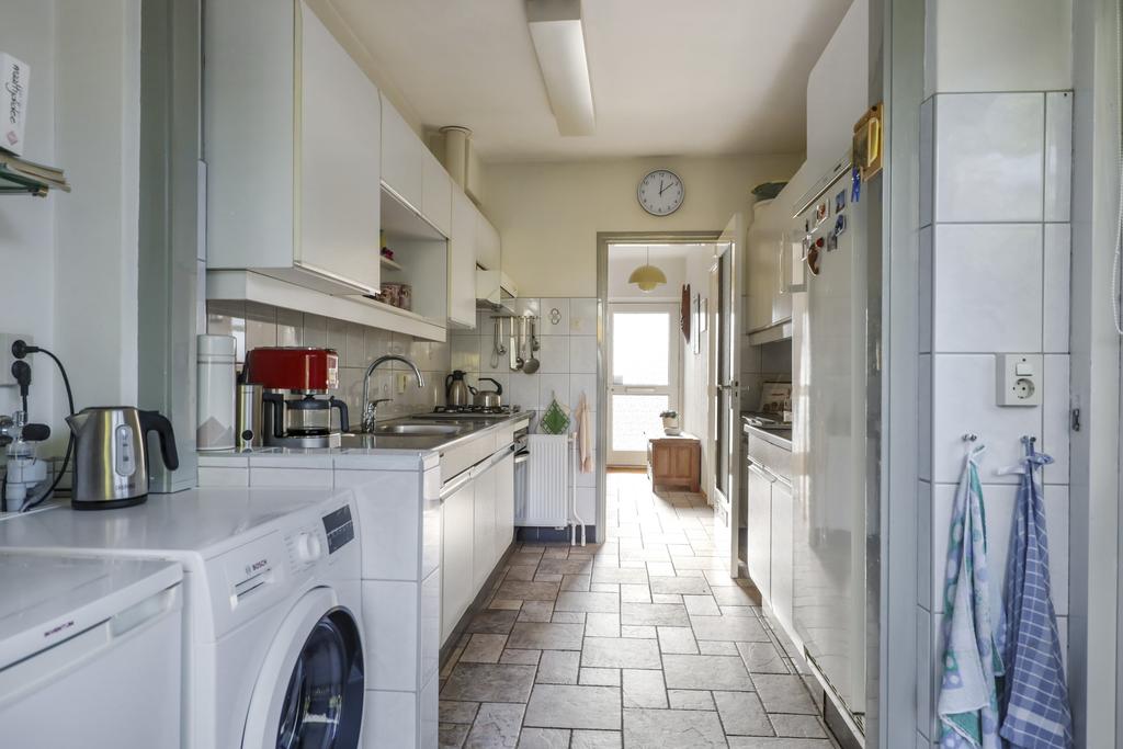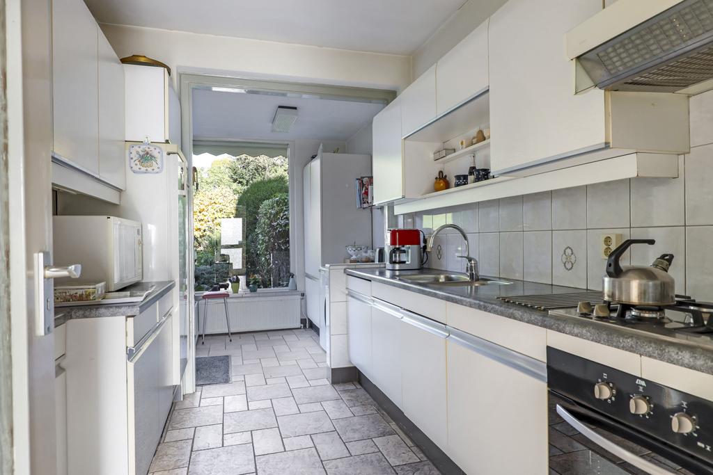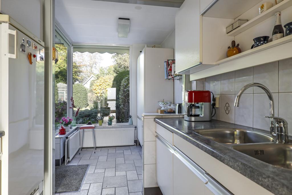 Wanneer je de keuken inloopt, zal je verrast worden door de ruimte die met de aanbouw gecreëerd is. Je zou het zelfs nog ruimtelijker kunnen maken door de tussenmuur (draagmuur) tussen de keuken en de woonkamer door te breken. Tegelijkertijd biedt het meer vrijheid om je eigen keukenopstelling te bedenken. De huidige keuken betreft een basis opstelling aan twee kanten, welke is voorzien van diverse inbouwapparatuur zoals een koelkast, een 4-pits gaskookplaat, en afzuiger en een oven. De aanbouw biedt veel glasoppervlak waardoor je het gevoel krijgt al op het buitenterras te zitten. Hier zou je eventueel een ontbijttafel kunnen plaatsen. De wasmachine-aansluiting zou je eventueel naar de 2e verdieping kunnen brengen.