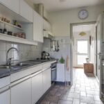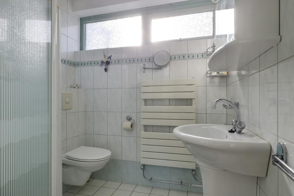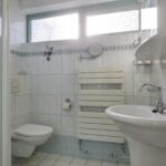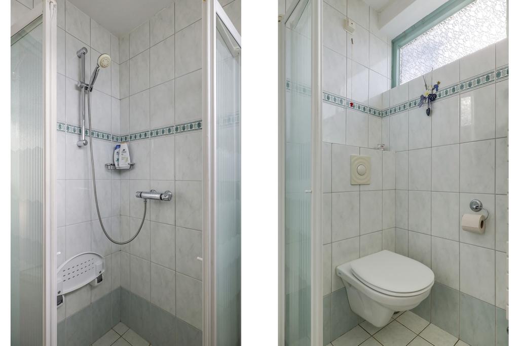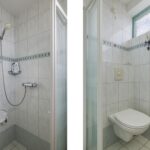 Voor de leeftijd van de woning is de badkamer hier opvallend groot. Er is zelfs ruimschoots plek voor een 2e toilet terwijl dit in die tijd zeker niet vanzelfsprekend was. De badkamer is verder ingedeeld met een inloopdouche en een wastafel. Boven de wastafel is een spiegelkast geplaatst. Ook de handdoekradiator is niet vergeten. Verder is er voor lichte kleurstellingen van het tegelwerk gekozen. Een groot pluspunt zijn de bovenlichten waardoor de badkamer veel daglicht heeft. Een uitzetraam zorgt voor de ideale ventilatiemogelijkheid.