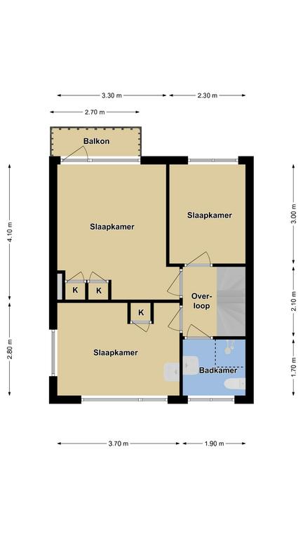 Via een ruime hal en prettige trapopgang bereiken we de 1e verdieping. Voor velen belangrijk om te weten: deze woning heeft een betonvloer (hollebaksteen) en géén houten vloer die we veel in deze bouwperiode tegenkomen. De verdieping is ingedeeld met 3 slaapkamers en de badkamer. De slaapkamers zijn respectievelijk 14m2, 10m2 en 7m2 groot en hebben allen rechte muren waardoor ze praktisch in te richten zijn. De 2 grootste slaapkamers hebben inbouwkasten maar deze zijn ook weg te halen wanneer je juist meer ruimte wenst of eigen kasten wilt plaatsen. De slaapkamer aan de voorzijde zou een prima tienerkamer kunnen zijn, aangezien het een eigen wastafel heeft. Een andere optie is een werkkamer. Het extra zijgevelraam zorgt hier voor een fijne lichtinval. Het balkon aan de achterzijde (3m2) biedt de mogelijkheid om een dekbed te laten luchten. Wanneer je bij het ochtendgloren de deur open zet, geniet je van het gezang van de vogeltjes in de bomen.