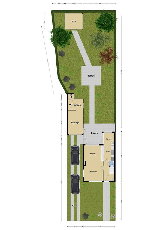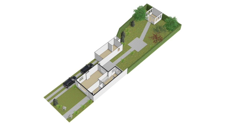 Wanneer je naar de kadastrale kaart kijkt, zie je al meteen dat de kavel hier niet ‘rechttoe-rechtaan’ is. Halverwege de achtertuin loopt het perceel in de breedte uit tot meer dan 12 meter breed. Bereken daarbij een diepte van ca. 22 meter en je realiseert je dat het hier geen doorsnee tuin is. Bij nieuwbouw kun je een dergelijk formaat achtertuin al helemaal niet voorstellen…