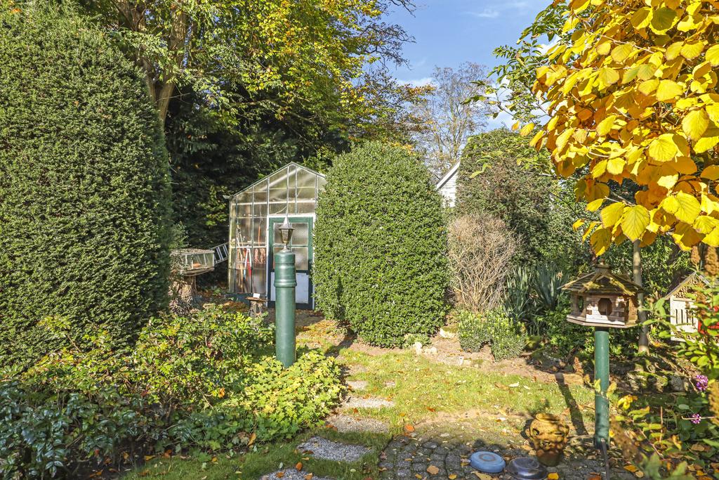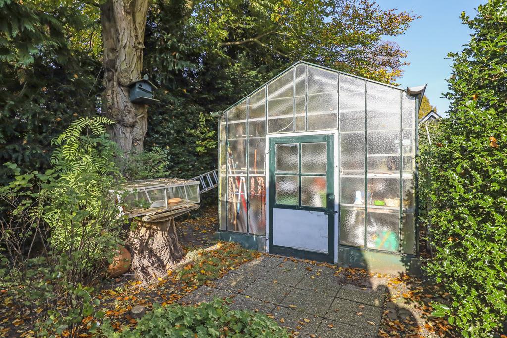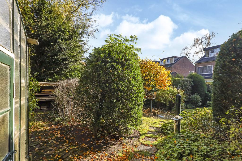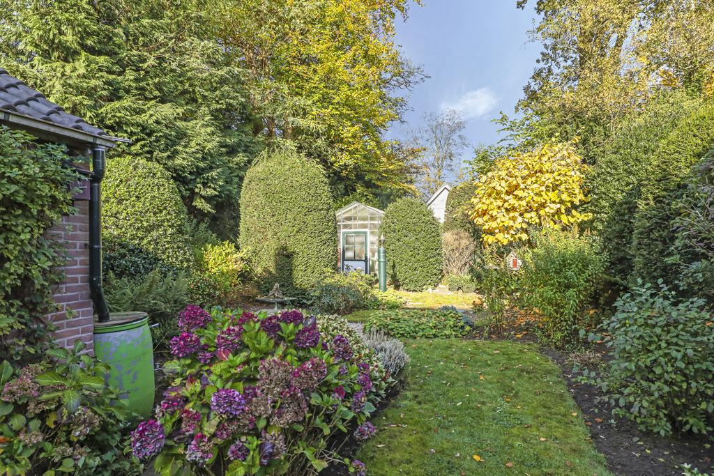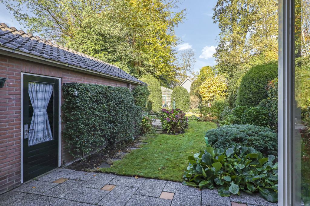 De tuin is groen aangelegd met vooraan bij de achtergevel een terras en halverwege de tuin. Zo kun je kiezen of dat je op een warme zomerdag in de zon of in de schaduw gaat zitten. Voor een (jong) gezin is de tuin extra aantrekkelijk omdat er ruimte genoeg is voor meerdere speeltoestellen. Het gazon nodigt in ieder geval uit om lekker te ravotten of een balletje te trappen. Meerdere volwassen bomen in de eigen tuin als ook in de omliggende tuinen geven je het gevoel of dat je aan een bosrand woont. Andere woningen zie je eigenlijk niet waardoor er nauwelijks tot geen inkijk is. Dit geeft je het ultieme vrijheidsgevoel. En heb je altijd al je eigen groente willen verbouwen? Dan zal je de hobbykas met elektra- en wateraansluiting achterin de tuin zeker kunnen waarderen.
