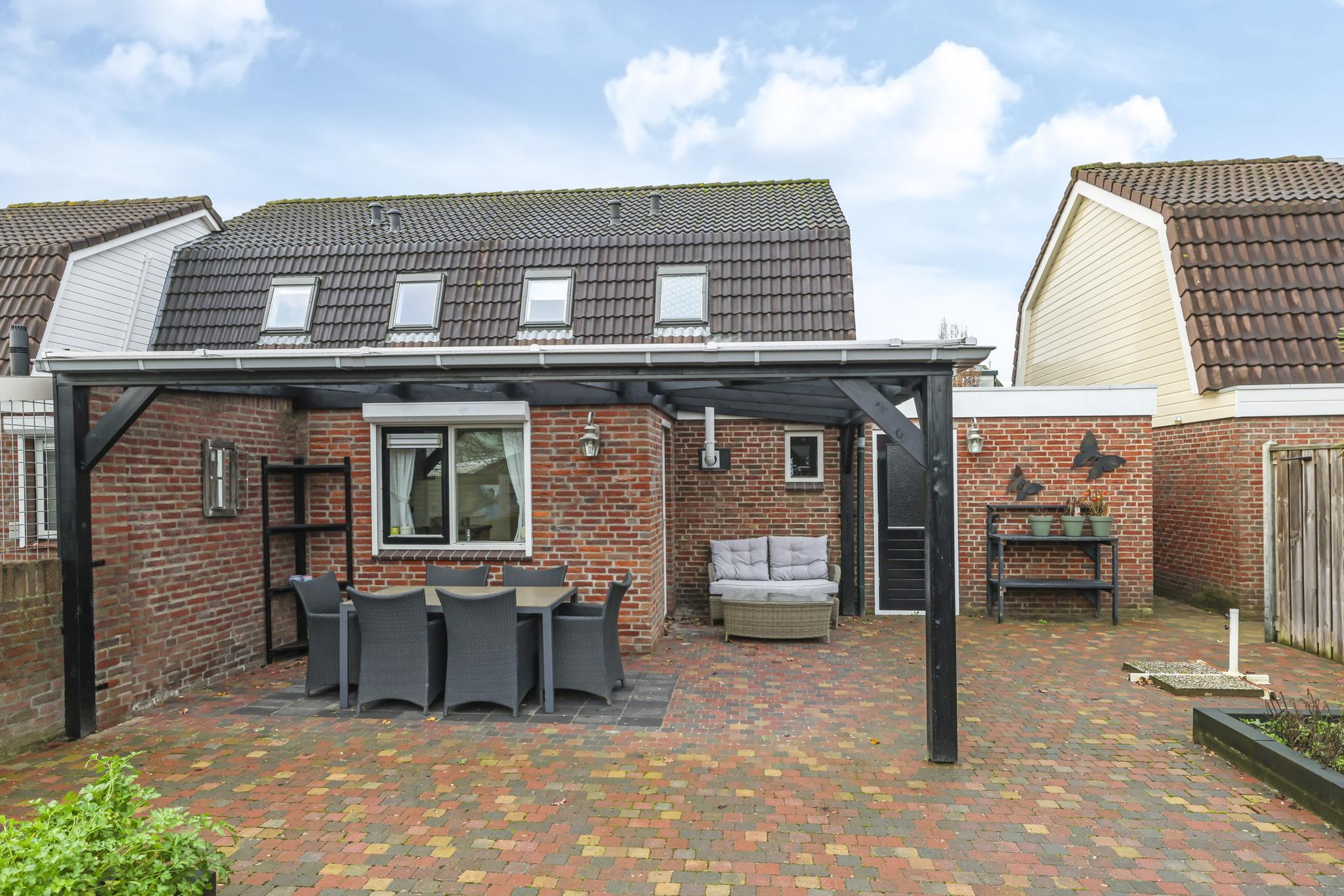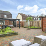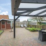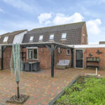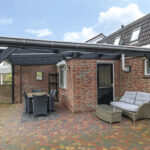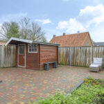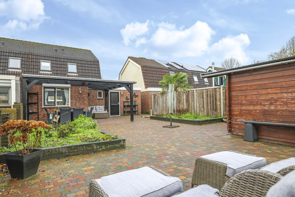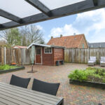 De achtertuin van deze woning is zeer verrassend. De woning staat midden in het dorp, echter zal je dit niet zo ervaren doordat er achter de woning relatief lage bebouwing is geplaatst. Hierdoor geniet je hier van veel ‘lucht’ en een weidser zicht. Aan de woning is een overkapping geplaatst welke recent is vernieuwd. Hier kan je in de zomerdag heerlijk zitten. De tuin is verder ingedeeld met een groot terras en 2 grote groenborders voor een groene uitstraling. Achter in de tuin staat een houten berging voor het opbergen van de tuinspullen. In de tuin is tevens een put gemaakt zodat er geen wateroverlast ontstaat bij veel regenval.