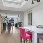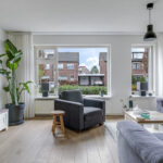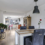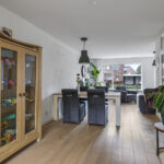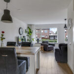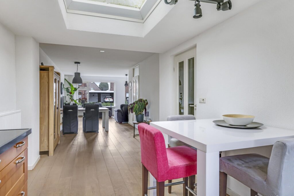 Doordat de woning aan de achterzijde is uitgebouwd, is de keuken verder naar achteren verplaatst waardoor er meer ruimte is ontstaan voor de woonkamer. Hierdoor kan je gemakkelijk een lekkere grote hoekbank en een eettafel kwijt. In de huidige opstelling is zelfs gekozen voor een extra ontbijtbar bij de keuken. Kortom, ruimte genoeg! Door de grote ramen heb je hier lekker veel lichtinval. Een fijn pluspunt daarbij is dat er voor de woning niet alleen een diepe voortuin, maar ook een groenstrook van de gemeente is gelegen. Hierdoor heb je een fijne buffer naar de straat toe en geniet je van meer privacy.