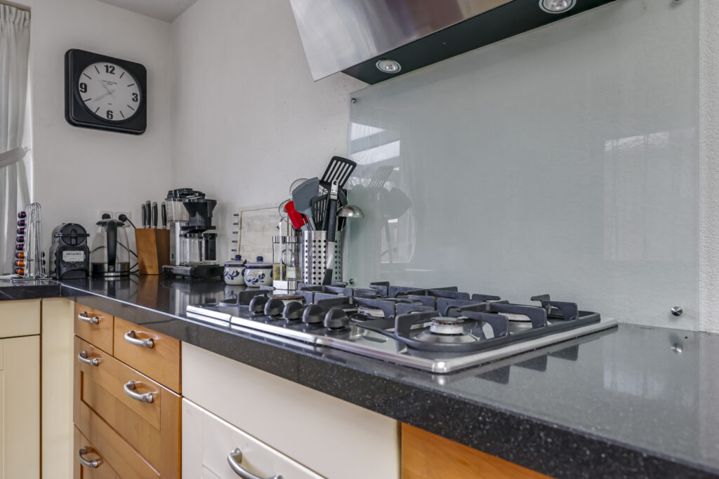 De keuken is aan de achterzijde gelegen en is daarmee tuingericht. Opvallend is dat de woning aan deze zijde is uitgebouwd waardoor er veel meer leefruimte is ontstaan. Erg prettig is daarbij de lichtkoepel welke zorgt voor extra lichtinval. Ook heb je vanaf hier een toegang tot de tuin. Het keukenblok is in een hoekopstelling geplaatst. De inbouwapparatuur bestaat uit een vaatwasser (2023), een combi-oven/magnetron (2024), een koelkast (2022), een 5-pits gaskookplaat en een afzuigkap. Het keukenblok is wat ouder echter zoals je ziet is er recent inbouwapparatuur vervangen.