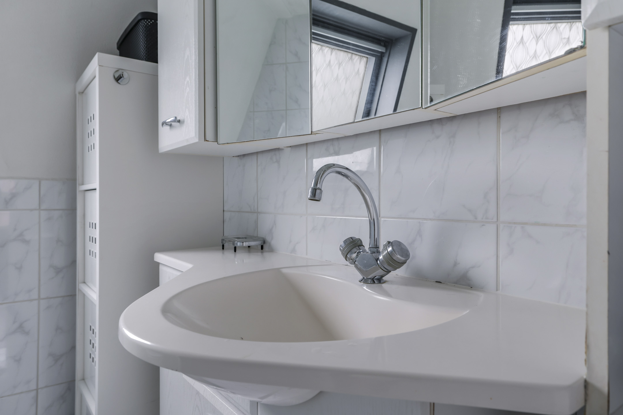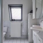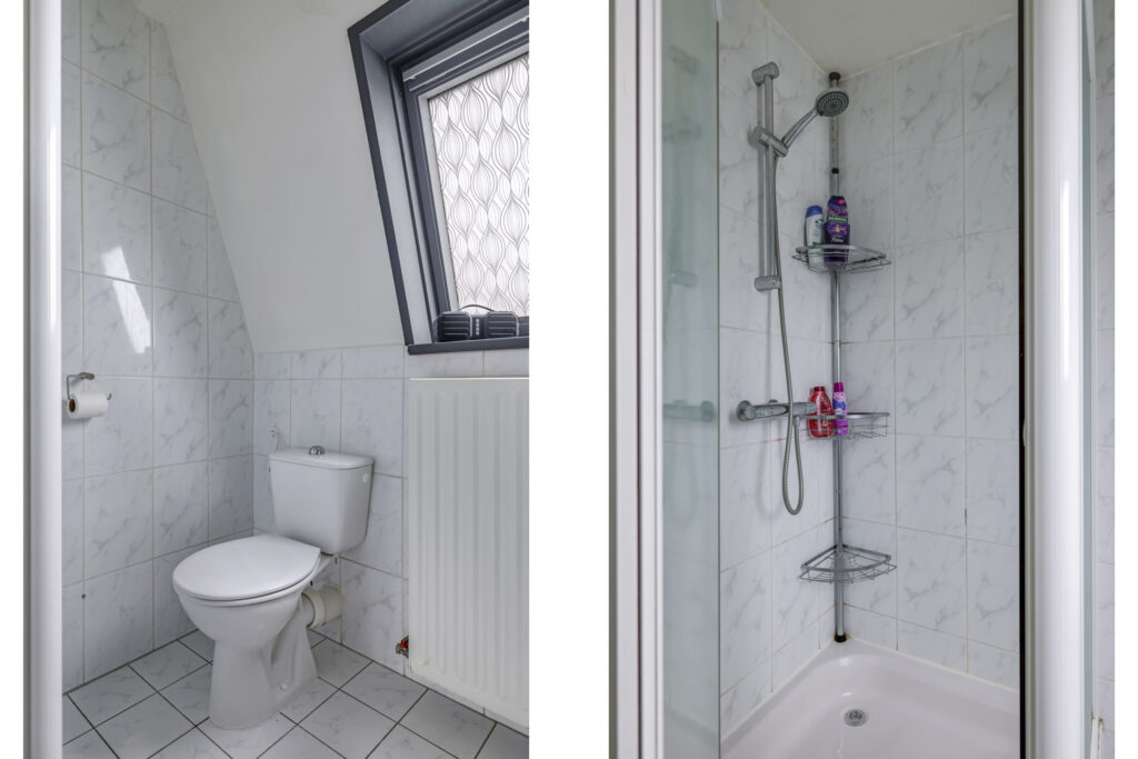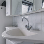 Tussen de slaapkamers in is de badkamer gelegen. Deze ruimte is praktisch ingedeeld met een douchecabine, een 2e toilet en een wastafelmeubel. Het meubel is voorzien van veel opbergruimte. Erg prettig is het dakraam wat zorgt voor een fijne lichtinval en een ventilatiemogelijkheid. Het tegelwerk is neutraal en degelijk uitgevoerd.