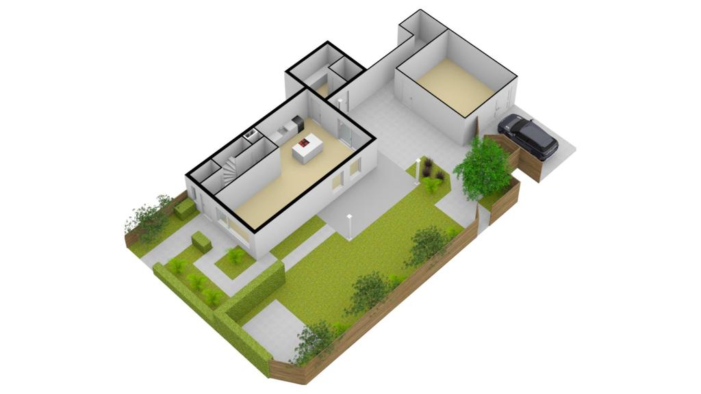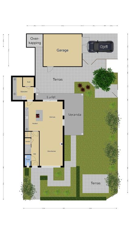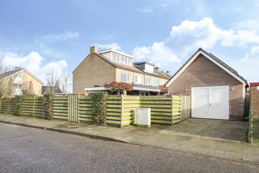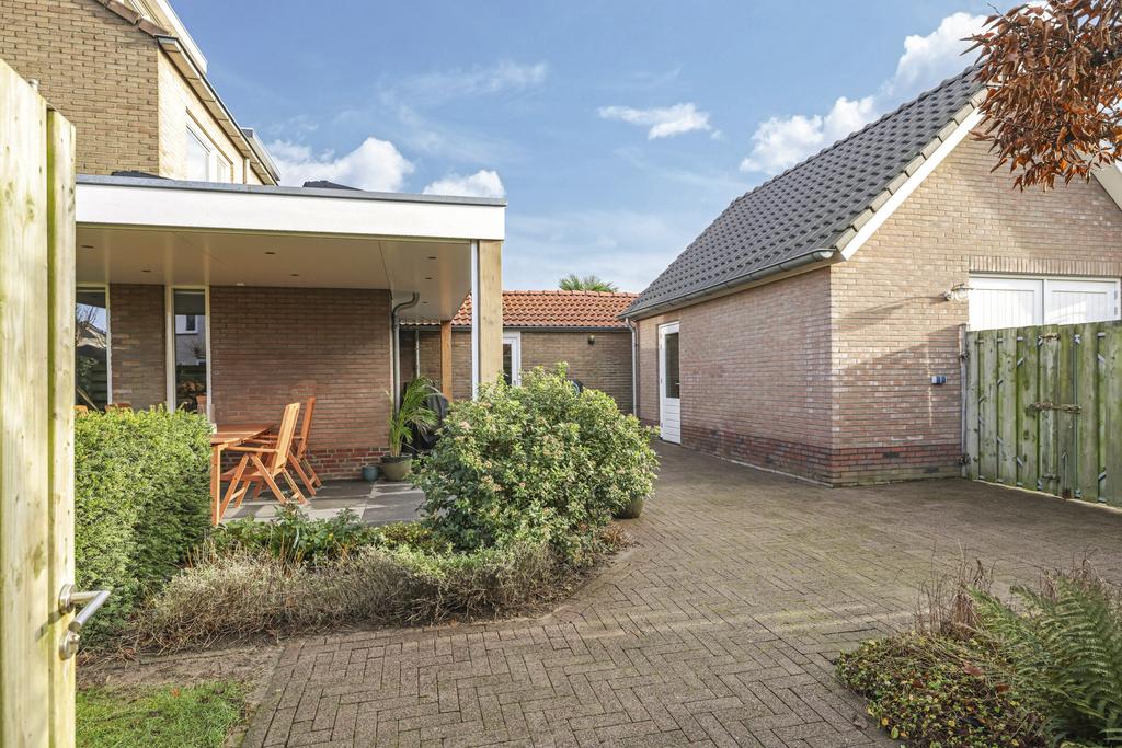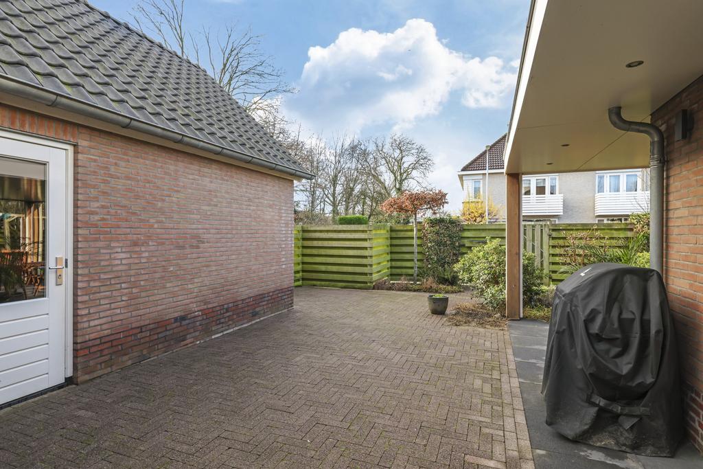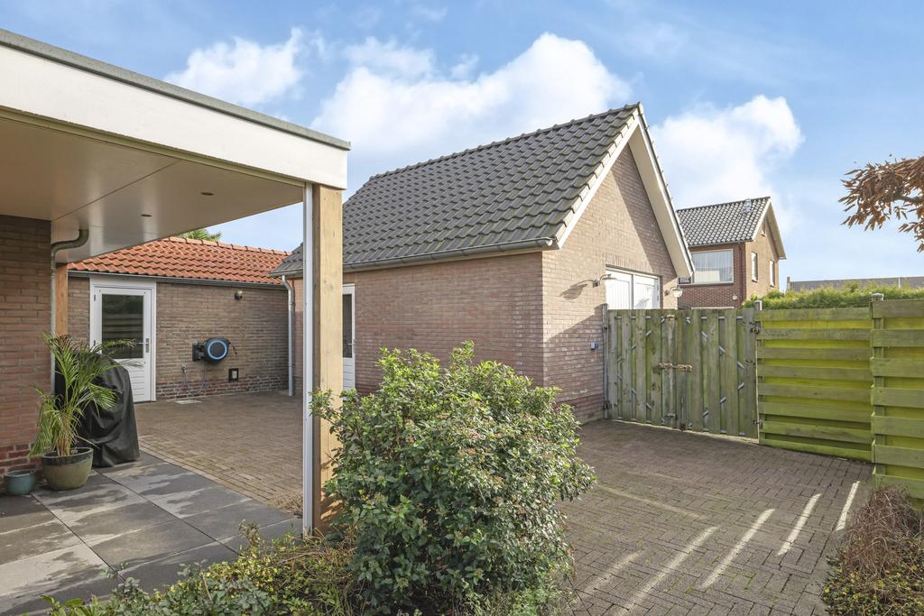Iets wat niet meteen opvalt, maar wel bijzonder praktisch is, is de overkapping voor de containers. Tussen de bijkeuken en garage is een ‘gangetje’ gelaten met achterin een soort van binnenplaats van ca. 5m2 die overkapt is. Hier is plek voor de containers, maar je kunt er ook gemakkelijk een fiets droog stallen. De tuin is goed toegankelijk voor bijvoorbeeld fietsen, bijvoorbeeld via de dubbele poort naar de oprit als via de poort in de schutting.