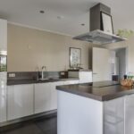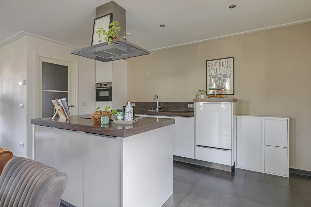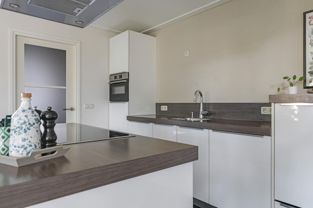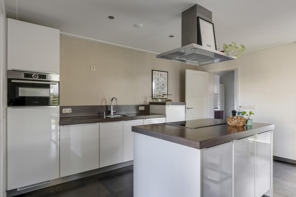 Keukens zijn doorgaans altijd ‘smaakgevoelig’ maar in dit geval is de kans groot dat je er erg happy mee zal zijn. Er zit een mooie balans in ruimte en opstelling waarbij het kookeiland centraal in de ruimte staat. Hoogglans witte fronten met strakke RVS grepen en een dik aanrechtblad geven de keuken een luxe en trendy uitstraling. De inbouwapparatuur bestaat uit een brede, inductie kookplaat (2023), een zwevende afzuigschouw, een vaatwasser op hoogte, een koelkast en een combi-oven/magnetron (2022). Alle inbouwapparatuur is van het merk Bosch. Met een hippe kleur op de strakke achterwand kun je de keuken alsnog een eigen ‘touch’ geven. Om het af te maken zijn er inbouwspots in het stucplafond geplaatst.