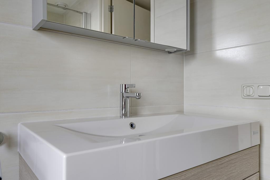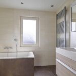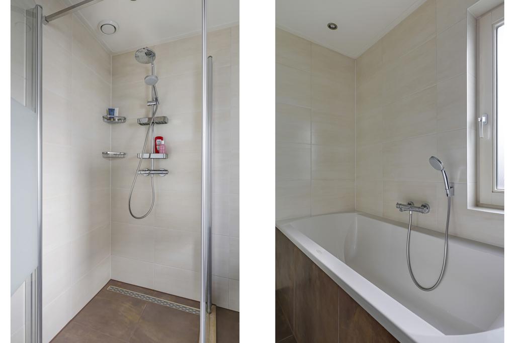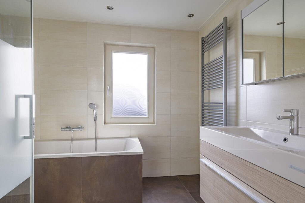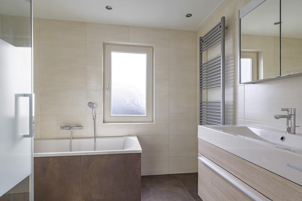 De van oorsprong 4e slaapkamer is dus opgeofferd voor een badkamer. Deze kamer is zelfs nog iets vergroot waardoor de badkamer een aantrekkelijk formaat heeft gekregen. De ruimte is ingedeeld met een volwaardig ligbad, een aparte inloopdouche en een breed wastafelmeubel. Boven het wastafelmeubel is een spiegelkast met extra verlichting geplaatst. Groot formaat tegels in aardetinten vergroten het optische gevoel. Net als de inbouwspots en het aanwezige raam. Deze zorgt niet alleen voor een fijne lichtinval, maar ook voor de ideale ventilatiemogelijkheid. Een strakke designradiator maakt de badkamer compleet.