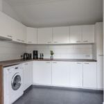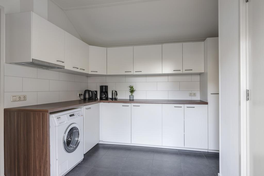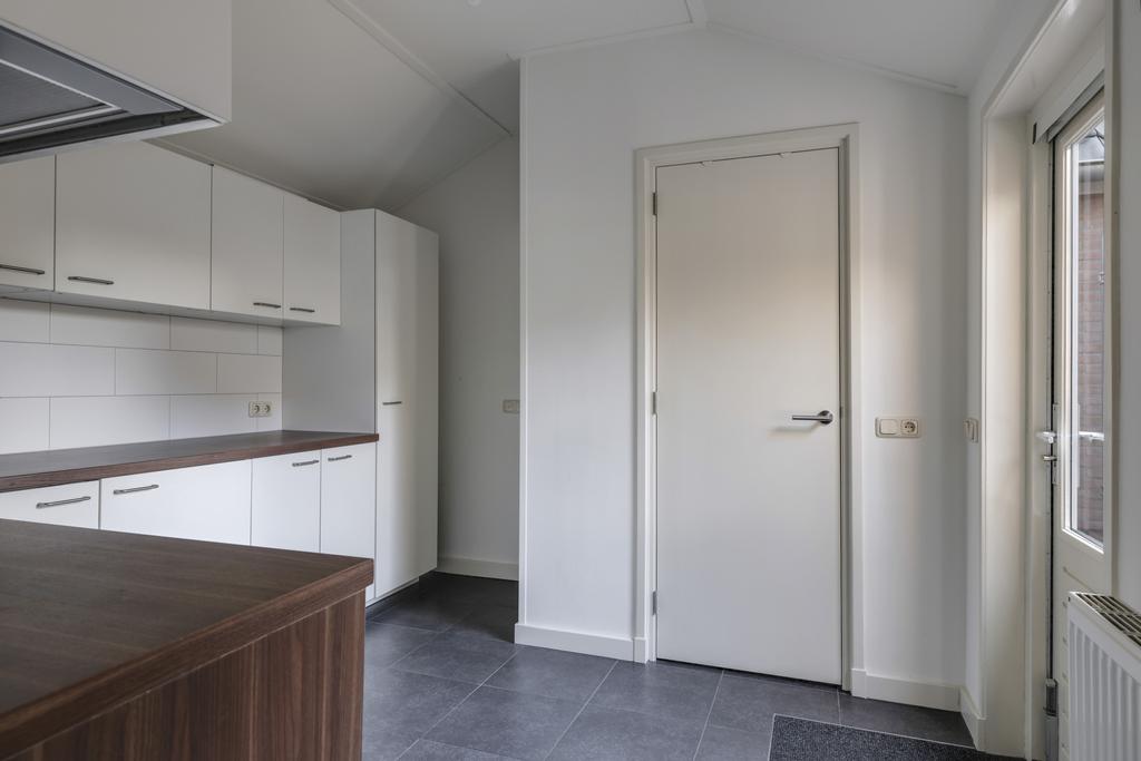 Zoals al eerder vermeld, is de voormalige schuur omgetoverd tot een heuse bijkeuken. Vanuit de keuken is er een directe doorloop. Je zult verrast zijn hoeveel deze bijkeuken te bieden heeft. Het is niet alleen bijzonder ruim (11m2) maar er staat zelfs een 2e keukenblok met extra inbouwapparatuur, te weten een koelkast, een vriezer en een afzuigkap. Naast veel praktische kastruimte, is er ook plaats voor de wasmachine. In de andere hoek is er een royale inbouwkast te vinden. Hier kun je grotere huishoudspullen kwijt zoals een stofzuiger en een strijkplank. Leuk detail is de hoogte van het plafond die doorloopt tot in de nok. En niet te vergeten de tuindeur die waarschijnlijk veel meer gebruikt zal worden dan de voordeur.