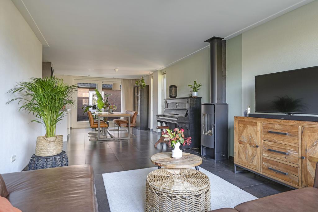 Woonkamer (uitgebouwd) met gashaard, eethoek en schuifpui