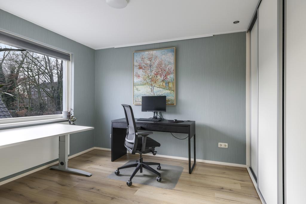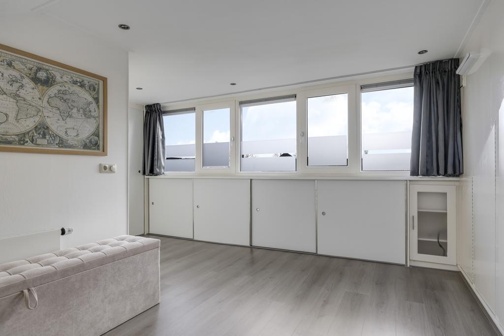 Een 2e vaste trap geeft toegang tot de 2e verdieping die bovenaan op de overloop afsluitbaar is. Dit zorgt ervoor dat er nog een verrassend grote, 4e slaapkamer aanwezig is. We hoeven niet uit te leggen dat de brede dakkapel hiervoor wel heel erg veel extra leefruimte zorgt. Gemeten vanaf 1,5 meter hoogte is deze kamer met ca. 15m2 dan ook meteen de grootste van allemaal. En dan hebben we de ruimte onder de schuine kant én de vaste kastenwand (kledingkast) nog niet eens meegeteld. De dakkapel maakt deze kamer erg aangenaam, ook omdat je de draai/kiepramen lekker kunt openzetten. Hetzelfde geldt voor het dakvenster tegenover de dakkapel. Om de zon enigszins te kunnen weren, is er een screen aangebracht die elektrisch te bedienen is.