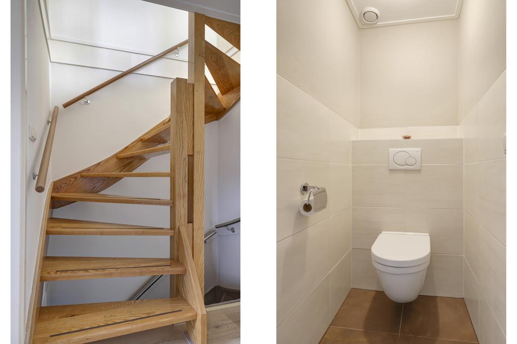 Ook op de verdiepingen is niets meer origineel gebleven. Van oorsprong had deze woning een piepkleine badkamer (tussen de slaapkamers in). De badkamer is verplaatst door een slaapkamer op te offeren waardoor de badkamer een aantrekkelijk formaat heeft gekregen. Vervolgens is er een extra (2e) toilet in de oude badkamer geplaatst waardoor er geen plekje op de badkamer vrijgemaakt hoefde te worden.
