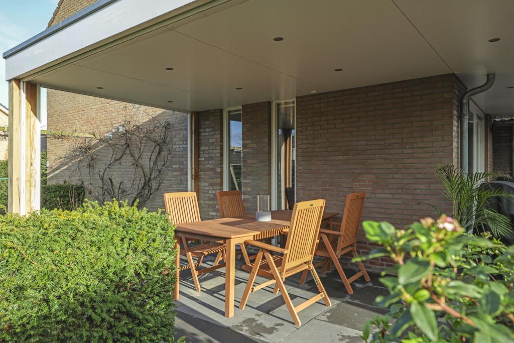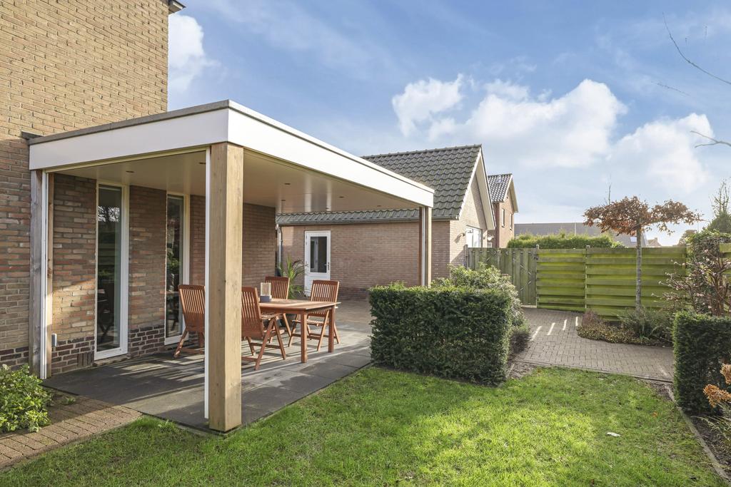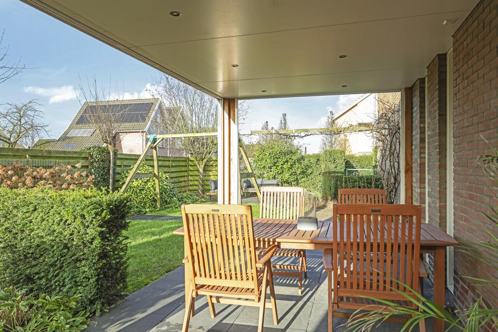 Wat hier wel heel fraai is gedaan, is de luifel en veranda die als het ware ‘om de hoek’ van de achter- en zijgevel is gebouwd. Loop je vanuit de woonkamer door de schuifpui de tuin in, dan heb je eerst een meter overstek (luifel) waar je altijd droog staat. Van daar loop je droog naar de veranda aan de zijkant van de woning. Hier kun je een heerlijke loungeset kwijt waar je na een dag werken, onder het genot van een wijntje of biertje, van de namiddag- en avondzon kunt genieten. Omdat de veranda een optimale zonligging heeft, zijn er 2 brede screens aangebracht waardoor je de veranda aan 2 zijdes kunt ‘afsluiten’ (elektrisch bedienbaar). Dit laatste maakt de veranda wel erg comfortabel waardoor de kans groot is dat je er ook lang blijft zitten. En wordt het schemerig, dan zorgen inbouwspots voor de nodige verlichting. Hou je van het buitenleven, dan mag je dit niet missen…