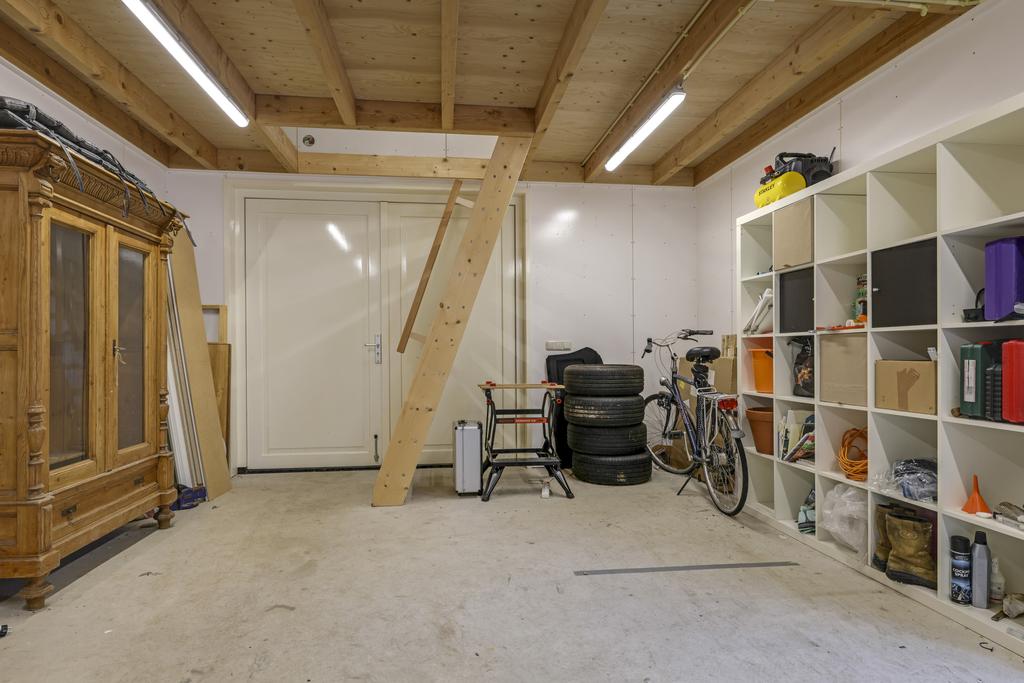 Zit je in de bouw, dan mag een goede garage (of klusruimte) niet ontbreken. Dat zal ook de gedachte van de huidige verkopers geweest zijn. Hier is niet zomaar een garage gebouwd. Deze garage is 6 meter lang en 5 meter breed (30m2) en is daardoor veel groter dan gemiddeld. Ook doordat het een zadeldak met zolder heeft. En niet onbelangrijk: de garage is volledig geïsoleerd (vloer, muren en dak). Een betonvloer zorgt ervoor dat de garage voor veel doeleinden geschikt is, net als de aanwezige elektra. Heb je een motor of een oldtimer, dan vind je hier de ideale stallingsruimte. Dubbele deuren geven toegang tot de oprit. En mocht je de zolder veelvuldig willen gebruiken voor bijvoorbeeld opslag, dan zou je de vaste trap naar zolder kunnen handhaven.