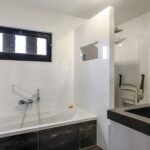 Moderne badkamer met o.a. ligbad, inloopdouche, toilet en dubbel wastafelmeubel